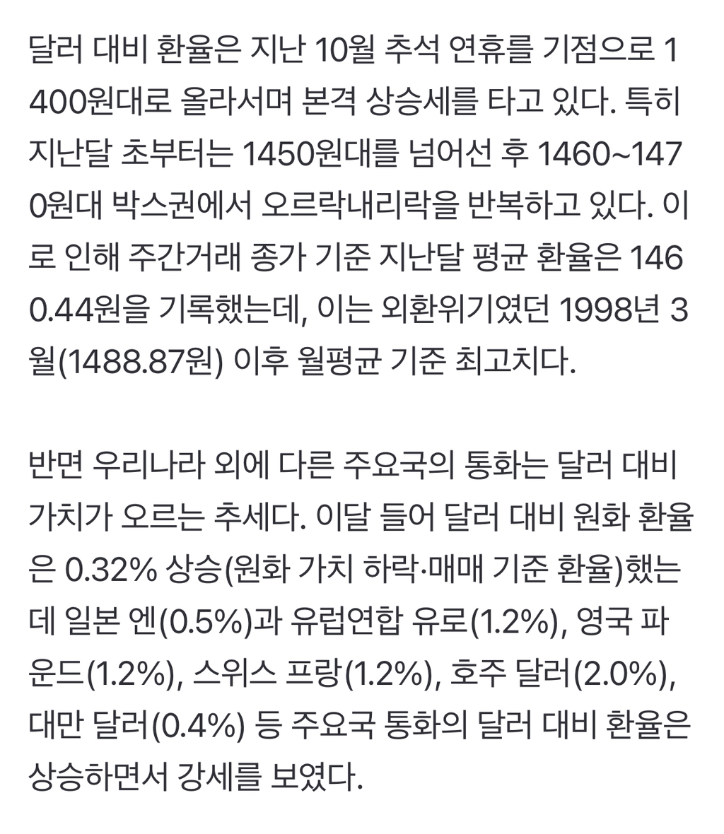작성자여행의이유 작성시간 25.12.17 환율때문에 머리 아파서 연어옴... 돈을 그만 풀라고요... 오늘 주유하는데 기름값 올라서 봤더니 국제유가 전세계적으로 5년만에 최전데 우리나라만 환율 ㅈㄴ 올라서 더 비싸게 넣고 있는 게 말이냐고