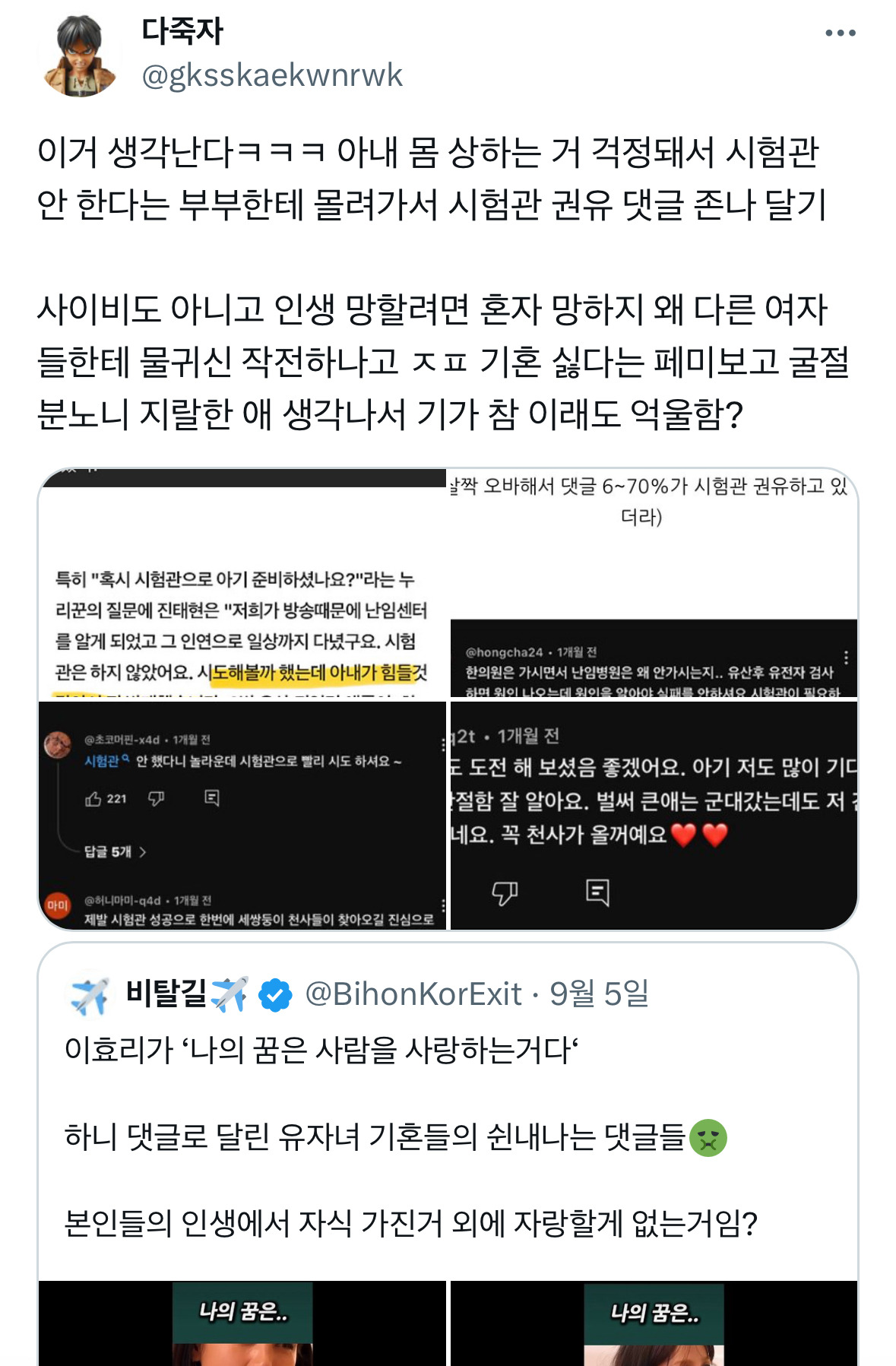 [스크랩] [흥미돋]이효리가 ‘나의 꿈은 사람을 사랑하는거다‘ 했더니 달리는 댓글 작성자p9i7y5r3w1|작성시간25.12.14|조회수15,160 목록 댓글 40 글자크기 작게가 글자크기 크게가 https://x.com/BihonKorExit/status/1963914704402686172X의 비탈길✈님(@BihonKorExit)이효리가 ‘나의 꿈은 사람을 사랑하는거다‘ 하니 댓글로 달린 유자녀 기혼들의 쉰내나는 댓글들🤢 본인들의 인생에서 자식 가진거 외에 자랑할게 없는거임?x.comhttps://x.com/gksskaekwnrwk/status/1964219067708912058X의 다죽자님(@gksskaekwnrwk)이거 생각난다ㅋㅋㅋ 아내 몸 상하는 거 걱정돼서 시험관 안 한다는 부부한테 몰려가서 시험관 권유 댓글 존나 달기 사이비도 아니고 인생 망할려면 혼자 망하지 왜 다른 여자들한테 물귀신 작x.com 다음검색 스크랩 원문 : *여성시대* 차분한 20대들의 알흠다운 공간 현재 게시글 추가 기능 열기 북마크 공유하기 신고 센터로 신고 댓글 댓글 40 댓글쓰기 답글쓰기 댓글 리스트 작성자바질데이지닥터페퍼 | 작성시간 25.12.14 설사같은 인간들끼리 ㅅㅂ100명 낳으셈 작성자독서준비생 | 작성시간 25.12.14 별안간 벅차오른 작성자구시렁씨부렁 | 작성시간 25.12.15 사회생활들 안해봤나 눈치도 없고 감도 없고 예의도 없음 작성자안태주. | 작성시간 25.12.15 와.............;;;;;;; 작성자쿄냥이 | 작성시간 25.12.15 징그럽단말밖에… 댓글 전체보기