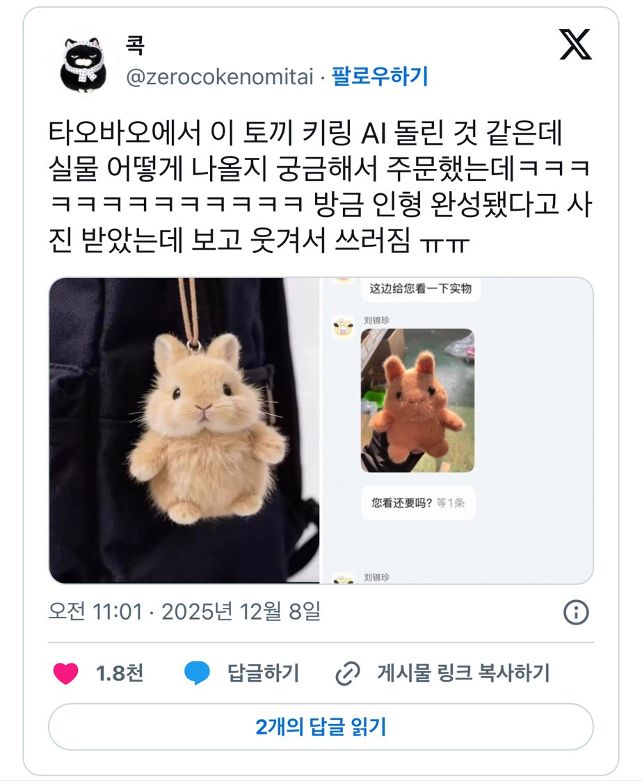 [스크랩] [흥미돋]타오바오에서 이 토끼 키링 AI 돌린 것 같은데 실물 어떻게 나올지 궁금해서 주문했는데..twt