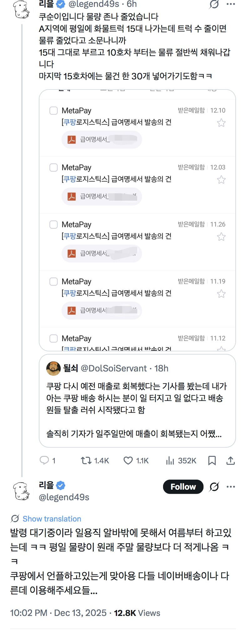 [흥미돋]쿠팡 매출 회복은 개구라 언플 작성자Sunmoonstar02|작성시간25.12.14|조회수51,985 목록 댓글 145 글자크기 작게가 글자크기 크게가 출처: https://x.com/legend49s/status/2000083833916670165?s=20연말인데도 사람 뽑는거 줄었다고 함다들 불매 잘하고 있다👍 다음검색 현재 게시글 추가 기능 열기 북마크 공유하기 신고 센터로 신고 댓글 댓글 145 댓글쓰기 답글쓰기 댓글 리스트 작성자맵싀짱 | 작성시간 25.12.15 탈퇴 ㄱ 작성자로또여내게로오라 | 작성시간 25.12.15 울 엄마도 먼저 나서서 불매한다고 하시던데 은근 불매 많이하는거 같음 작성자솔솔의눈 | 작성시간 25.12.15 그 좃본 옷가게도 저렇게 구라언플 한참 쳣엇자나 작성자해낸다낸다낸다 | 작성시간 25.12.16 불매고 작성자MPRO | 작성시간 25.12.24 울회사 로켓프레쉬납품업첸데 주문도 존나줄음 댓글 전체보기