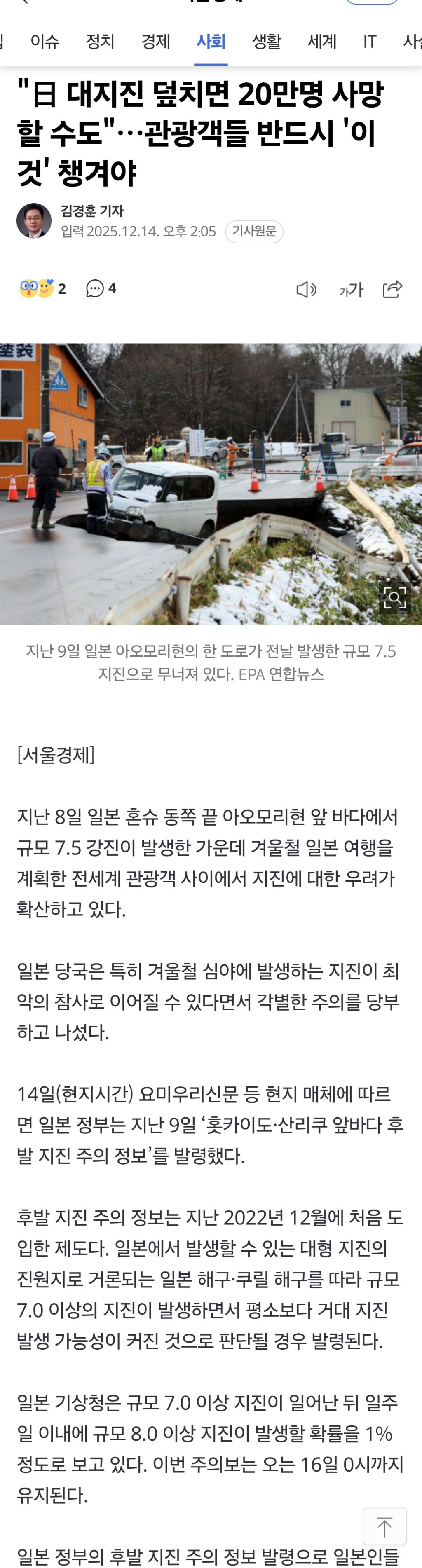 [여시뉴스데스크]"日 대지진 덮치면 20만명 사망할 수도"…관광객들 반드시 '이것' 챙겨야 작성자외숙모|작성시간25.12.14|조회수14,860 목록 댓글 9 글자크기 작게가 글자크기 크게가 출처: https://naver.me/x0Xb1ppX"日 대지진 덮치면 20만명 사망할 수도"…관광객들 반드시 '이것' 챙겨야지난 8일 일본 혼슈 동쪽 끝 아오모리현 앞 바다에서 규모 7.5 강진이 발생한 가운데 겨울철 일본 여행을 계획한 전세계 관광객 사이에서 지진에 대한 우려가 확산하고 있다. 일본 당국은 특히 겨n.news.naver.com 다음검색 현재 게시글 추가 기능 열기 북마크 공유하기 신고 센터로 신고 댓글 댓글 9 댓글쓰기 답글쓰기 댓글 리스트 작성자토리우주 | 작성시간 25.12.14 일본에 안가는 개념을 챙겨라좀 작성자하준이소리좀안나게해라 | 작성시간 25.12.14 굿~ 작성자쪽짱 쌍으로 난리다 진짜 | 작성시간 25.12.14 종이학 챙기면 될듯 작성자Rubencervantes | 작성시간 25.12.15 놀러갔는데 뭘 챙겨 저승사자랑 하이파이브나 하겠지 작성자재극기부대모드ON | 작성시간 25.12.15 기왕 챙겨간거 쓸일이 생겨서 요긴하게 쓰셨으면 좋겠네요~ 댓글 전체보기