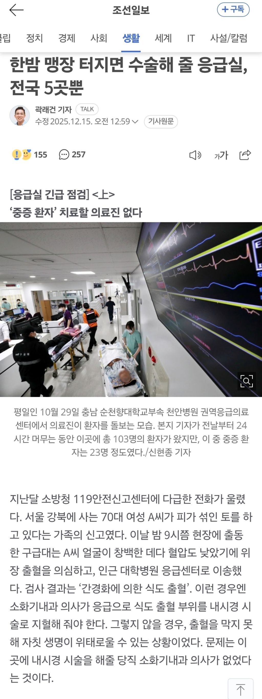 작성자쑥떡인절미 작성시간 25.12.15 식도 정맥류는 응급맞믄제 맹장 하나 터졌다고 바로 응급아님....빵꾸 뚫려서 새는것도 아니고 단순 맹장은 전국 어딜가도 야간에 당직의불러서 응급으로 뭔 수술을함.... 진짜 알못기자가 쓴 기사인거 티난다 아님 일부러 논란만들라고 쓴거거나...