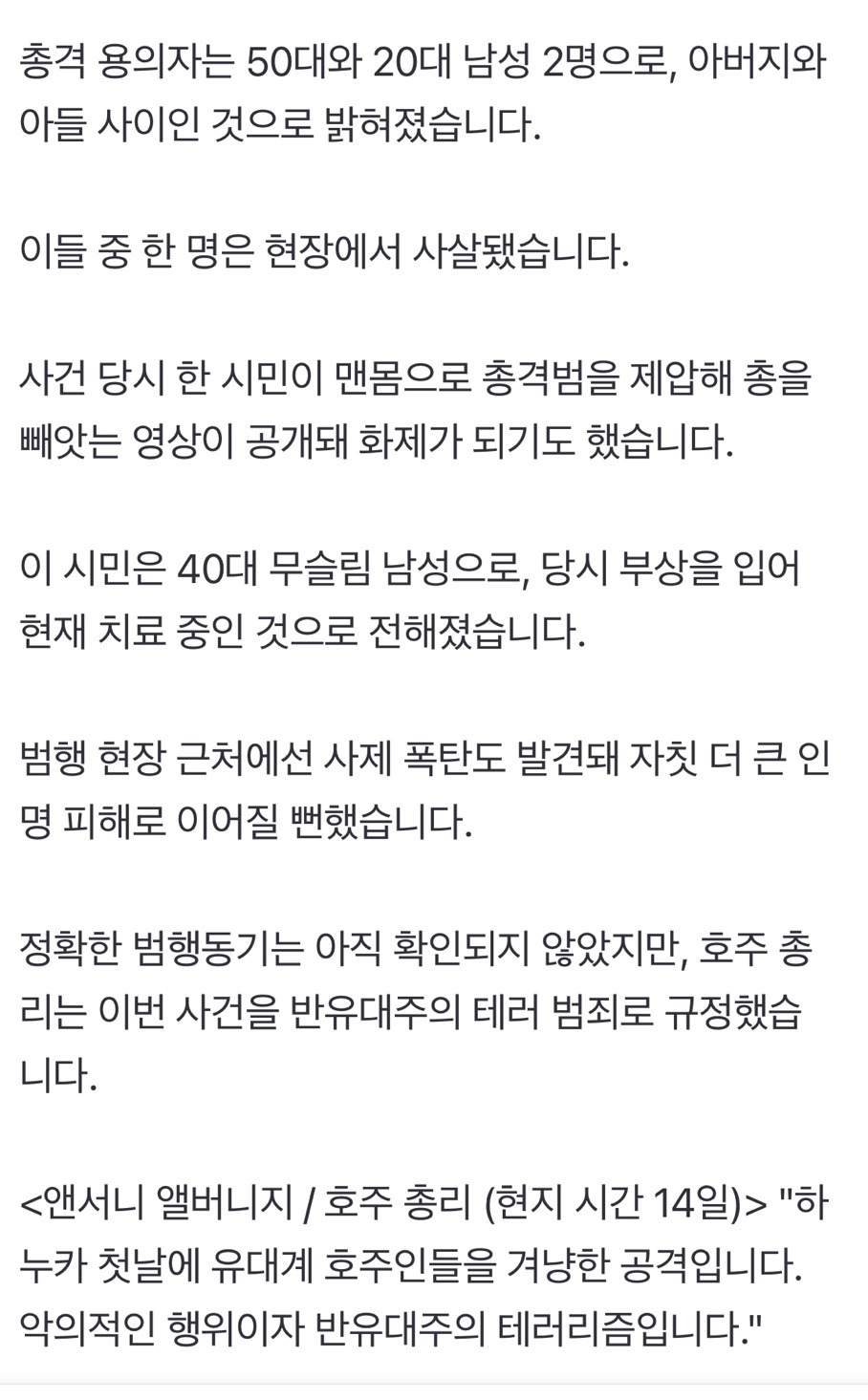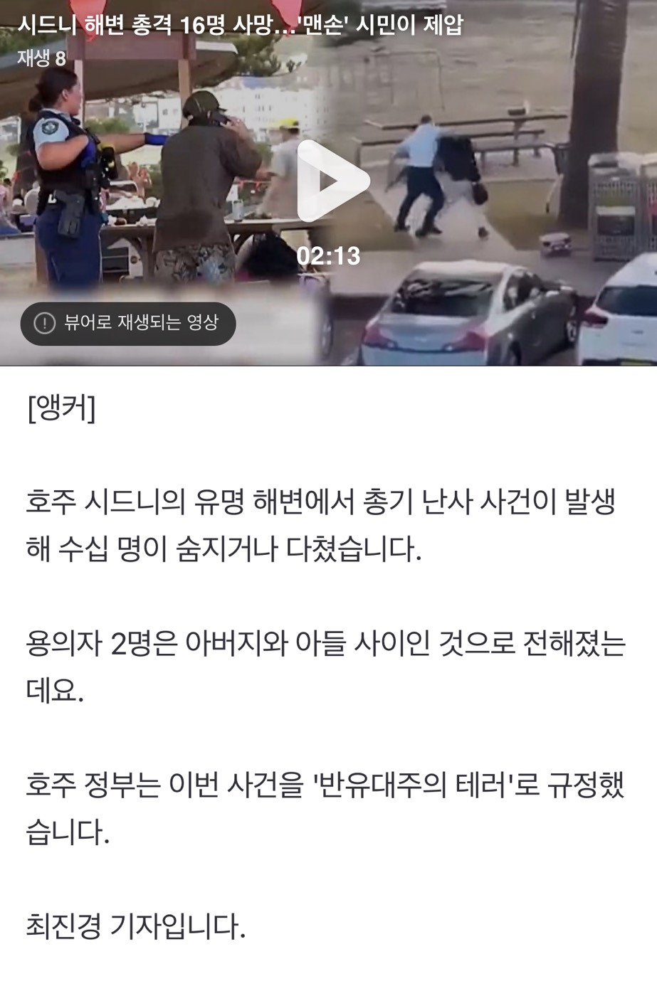 [여시뉴스데스크]시드니 해변 총격 16명 사망…'맨손' 시민이 제압 작성자배구노예|작성시간25.12.15|조회수12,005 목록 댓글 10 글자크기 작게가 글자크기 크게가 출처: https://n.news.naver.com/article/422/0000812344?sid=104시드니 해변 총격 16명 사망…'맨손' 시민이 제압호주 시드니의 유명 해변에서 총기 난사 사건이 발생해 수십 명이 숨지거나 다쳤습니다. 용의자 2명은 아버지와 아들 사이인 것으로 전해졌는데요. 호주 정부는 이번 사건을 '반유대주의 테러'n.news.naver.com전문 출처로 다음검색 현재 게시글 추가 기능 열기 북마크 공유하기 신고 센터로 신고 댓글 댓글 10 댓글쓰기 답글쓰기 댓글 리스트 작성자스위트 포테이토 | 작성시간 25.12.15 시발 홀로코스트 생존자를… 진짜 몇십 년이나 지났는데도 핍박은 나아지질 않는구나 작성자순수마들렌 | 작성시간 25.12.15 ㅜㅜㅜㅜ 작성자가감감 | 작성시간 25.12.15 진짜ㅆㅂ너무 안타까워 작성자삼순이네방앗간 | 작성시간 25.12.15 ㅠㅠ영웅이시네… 본인도 무서웠을텐데..ㅠㅜ개샛키들 홀로코스트 생존자분들까지.. 작성자얼아이니드이쥬 | 작성시간 25.12.15 ㅠㅠ..... 하.... 댓글 전체보기