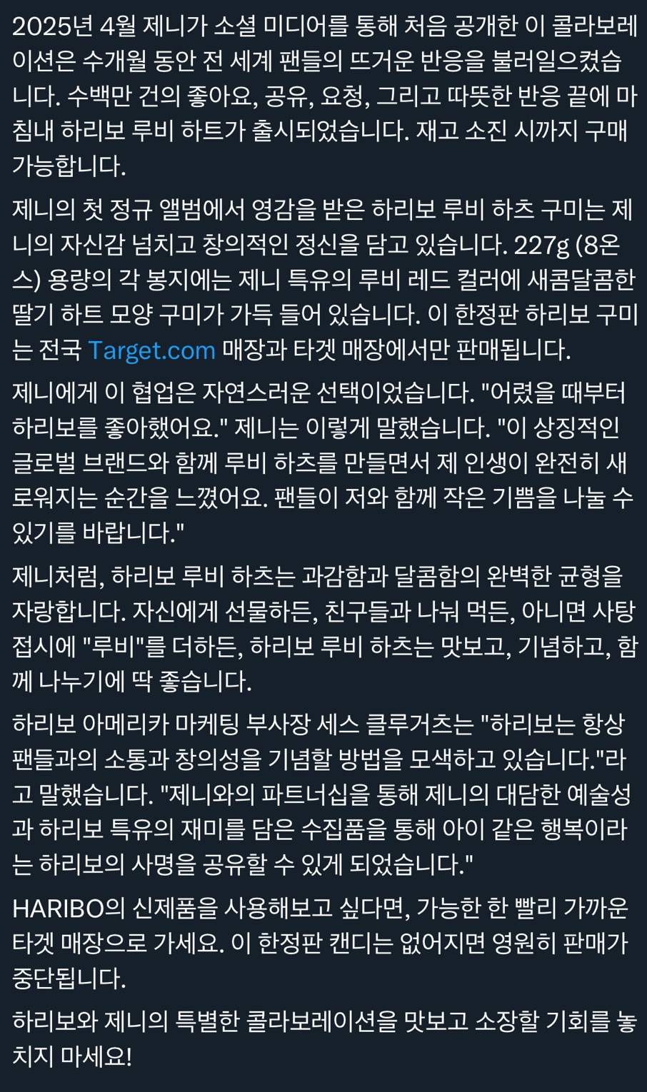 [스크랩] [흥미돋]미국 하리보와 콜라보한 블랙핑크 제니 작성자ㅋㅎㅍㄹㅊ|작성시간25.12.15|조회수32,724 목록 댓글 17 글자크기 작게가 글자크기 크게가 출처: 여성시대 곰구미베어미국 타겟 매장에서 구매 가능뒷면에 있는 QR 코드를 찍으면음원 사이트별로 제니 앨범도 들을 수 있다함제니 x 하리보 콜라보 굿즈제니 착용샷제니 팔로중인 하리보 usa 계정 다음검색 스크랩 원문 : *여성시대* 차분한 20대들의 알흠다운 공간 현재 게시글 추가 기능 열기 북마크 공유하기 신고 센터로 신고 댓글 댓글 17 댓글쓰기 답글쓰기 댓글 리스트 작성자김깅깅 | 작성시간 25.12.15 제니 너무좋아..젤리싫어하지만 사볼래.. 작성자고양이오너 | 작성시간 25.12.15 맛은 기존 하트랑 똑같은건가? 작성자떡볶이닭갈비김피탕 | 작성시간 25.12.15 ㅁㅊ 콜라보도 감다살 작성자시 츄 | 작성시간 25.12.16 사고싶다... 작성자나다요요요 | 작성시간 25.12.21 나 이거 기다렸는데..한국은 안내주나 ㅠ 댓글 전체보기