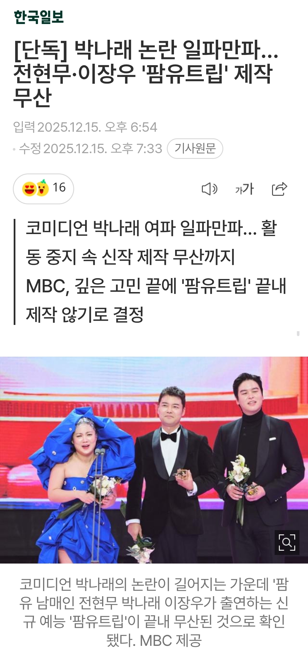 작성자고내기 작성시간 25.12.16 이건 상관없는데 장도연 신기루 허안나랑 여행영상 찍은거 다 촬영해놨는데 못 나가게 생겼다든데