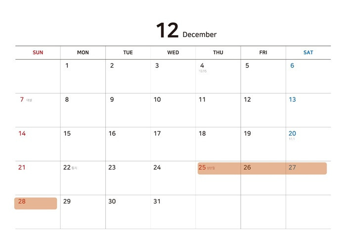 오는 12월 성탄절은 목요일이다. 오는 12월26일 금요일에 연차를 사용하면 주말을 합쳐 총 4일을 쉴 수 있다. 10월에 연휴가 몰려 11월에는 공휴일이 하나도 없고, 12월에도 성탄절 하루만 연휴가 있다.