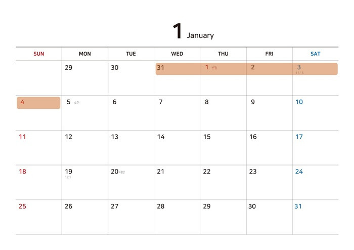 내년 1월은 신정 연휴를 제외하면 공휴일이 없다. 3월에도 삼일절이 주말이라 대체휴일 하루만 발생하기 때문에 내년 2월 연차로 잠시 쉬어가는 시간을 만드는 것도 꿀팁이 될 수 있다.