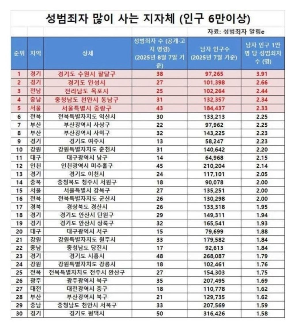 수원은 남자 4명당 1명은 성범죄자네