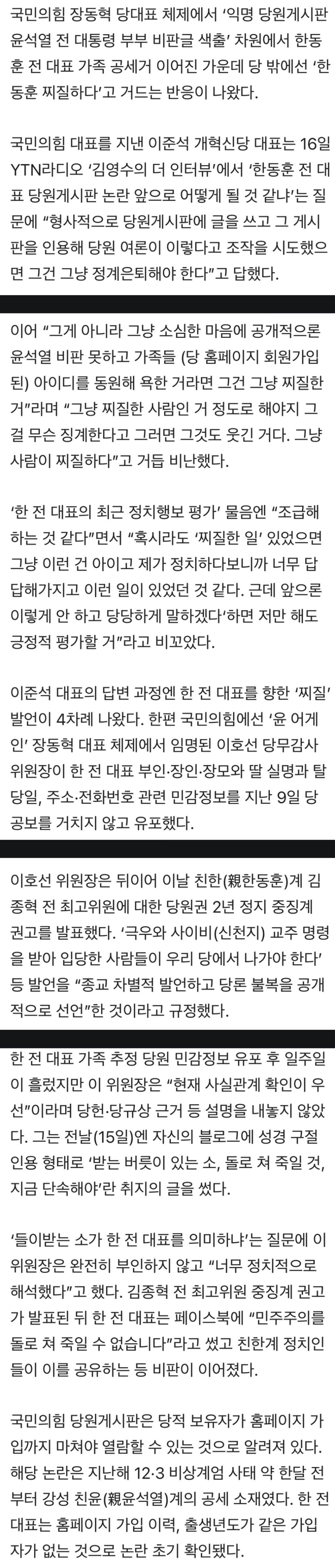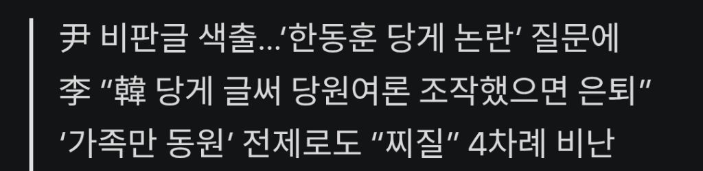 [스크랩] [여시뉴스데스크]이준석 "한동훈, 그냥 찌질... 당원 게시판 사실이면 정계 은퇴해야" 작성자외숙모|작성시간25.12.17|조회수1,474 목록 댓글 21 글자크기 작게가 글자크기 크게가 https://v.daum.net/v/20251216222238934국힘 난리통에 이준석 “한동훈 그냥 찌질, 찌질, 찌질…당게 글 썼으면 은퇴를”국민의힘 장동혁 당대표 체제에서 ‘익명 당원게시판 윤석열 전 대통령 부부 비판글 색출’ 차원에서 한동훈 전 대표 가족 공세거 이어진 가운데 당 밖에선 ‘한동훈 찌질하다’고 거드는 반응v.daum.net 다음검색 스크랩 원문 : 이종격투기 현재 게시글 추가 기능 열기 북마크 공유하기 신고 센터로 신고 댓글 댓글 21 댓글쓰기 답글쓰기 댓글 리스트 작성자천혜향타르트 | 작성시간 25.12.17 자기소개 작성자이런??! | 작성시간 25.12.17 지는ㅋㅋㅋㅋㅋㅋㄱㄲ 작성자아기 망곰 | 작성시간 25.12.17 너부터 작성자별의 그릇 | 작성시간 25.12.17 국짐도 아니잖아 너는 작성자우롱우롱우렸다 | 작성시간 25.12.17 니도 해러 댓글 전체보기