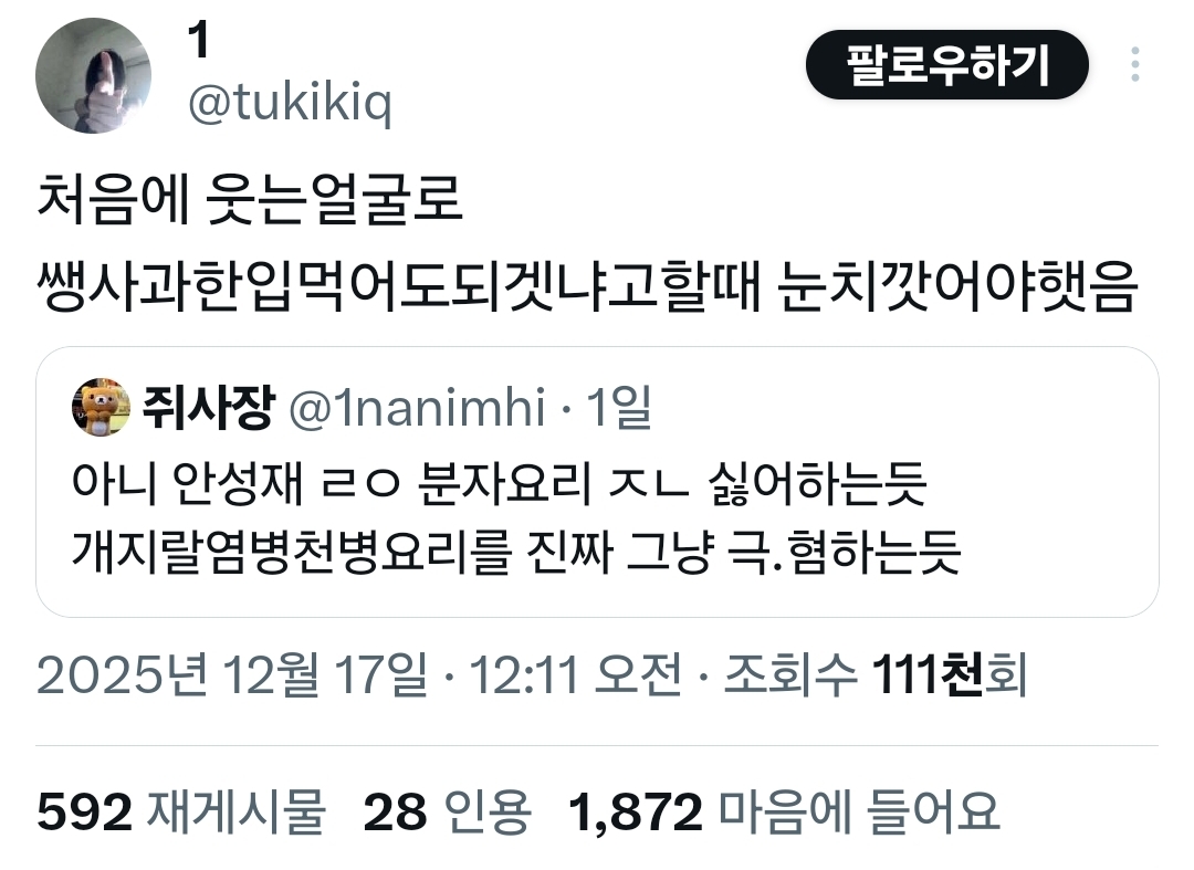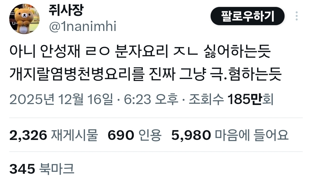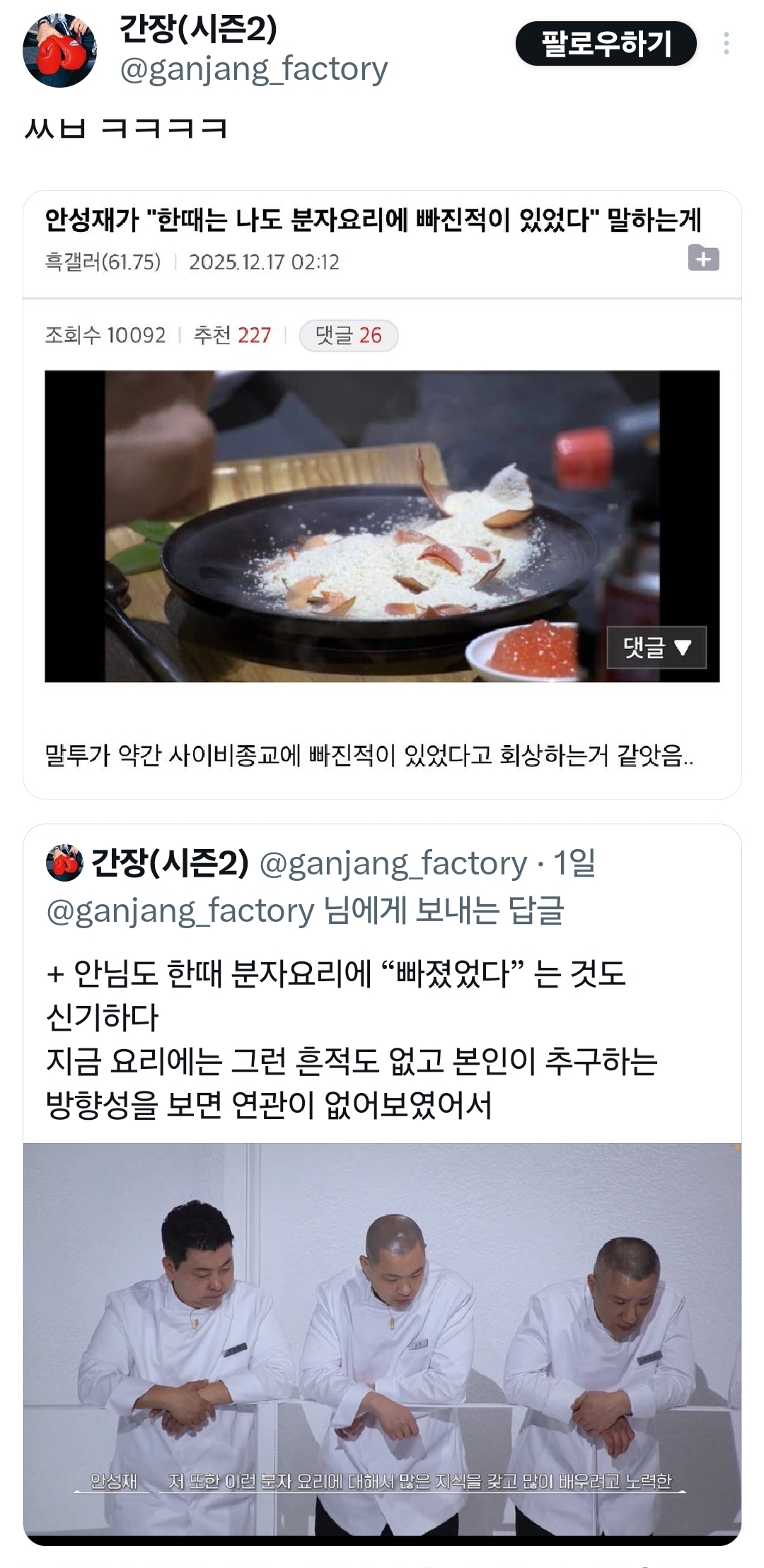 작성자망맹맹망몽뭉 작성시간 25.12.19 개지랄염병천병요리인데 발전이 없는ㅋㅋㅋㅋㅋㅋㅋㅋ 안성재가 ㅈㄴㅈㄴ 싫어할만도ㅋㅋㅋㅋㅋㅋㅋㅋㅋㅋㅋ