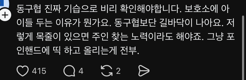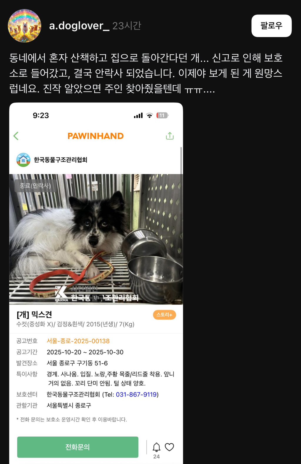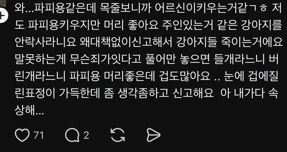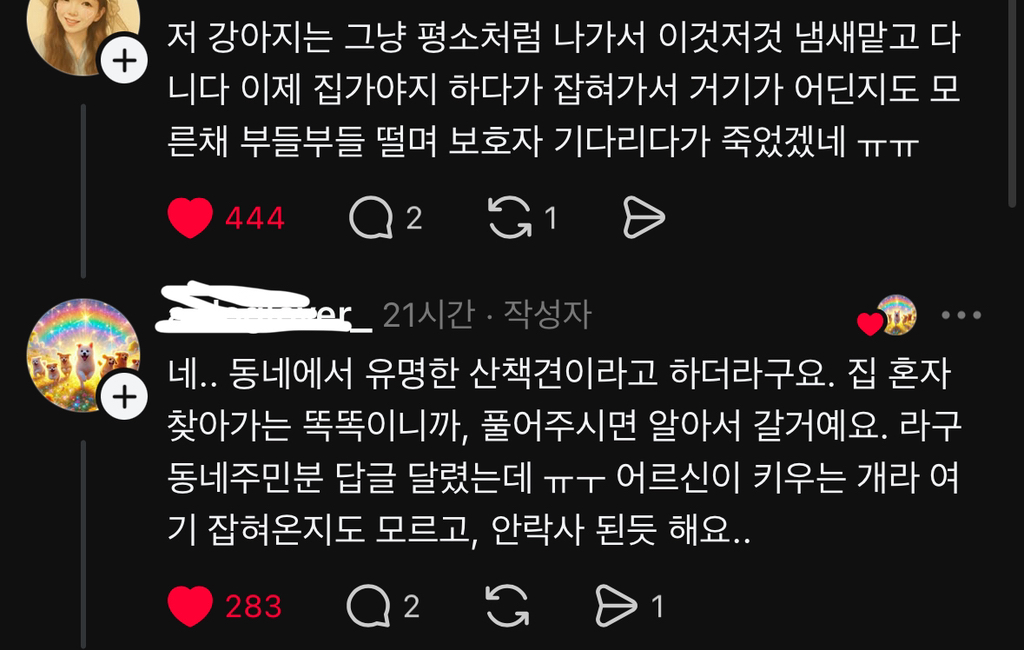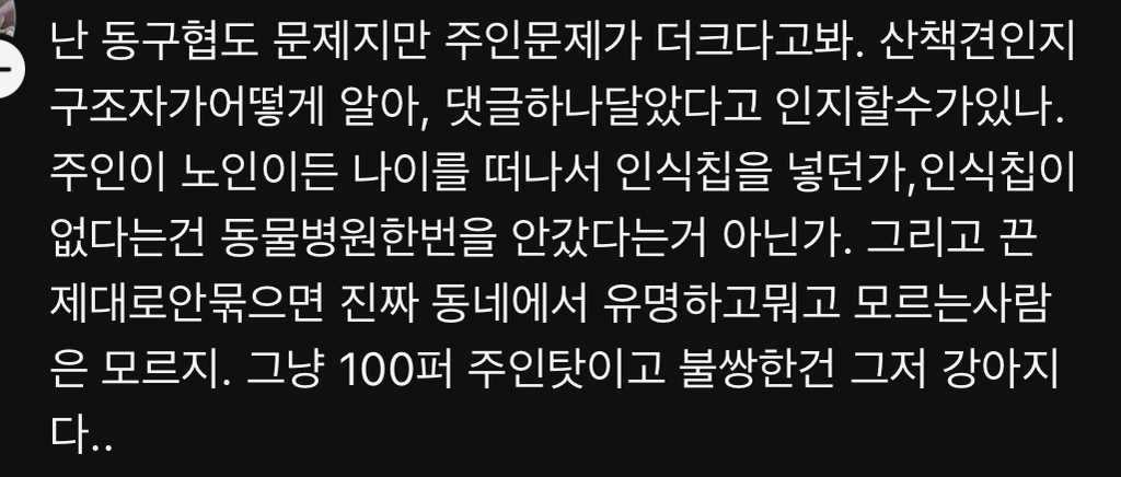 산책견이었다고 하는데 풀어놓고 키우는 강아지도 잘못되긴했지만....(로드킬,개장수 위험)