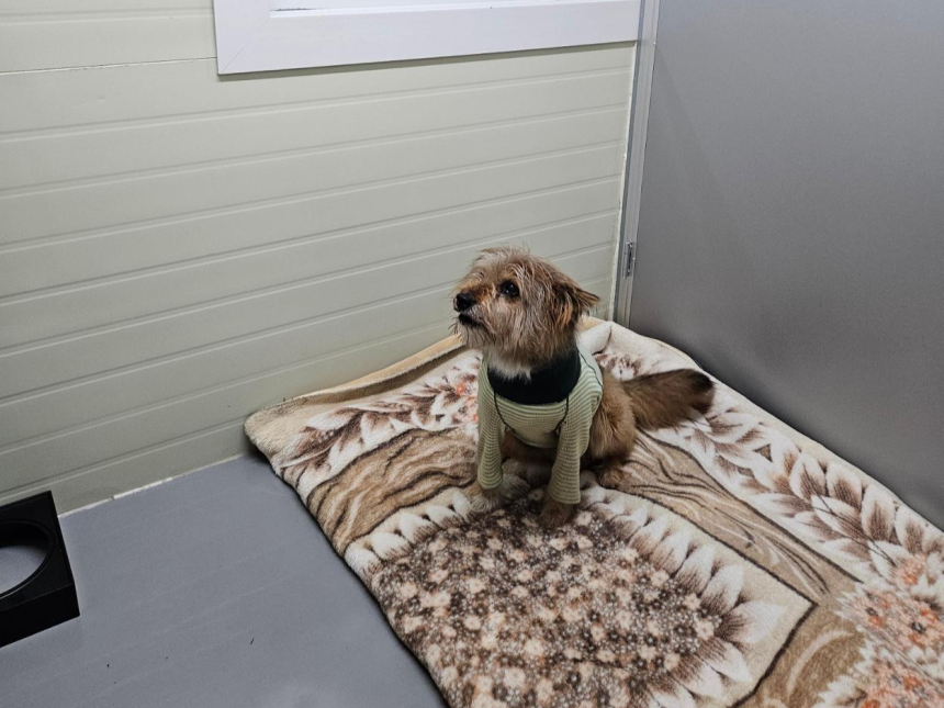동물보호소에서 가족을 기다리는 개가 교정시설로부터 기증받은 모포 위에 앉아 있다. 팅커벨프로젝트 제공