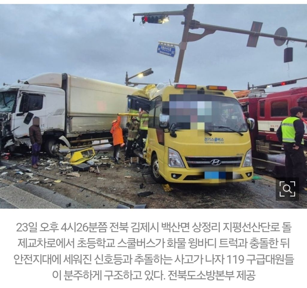 23일 전북도소방본부에 따르면 이날 오후 4시26분쯤 김제시 백산면 상정리 지평선산단로 돌제교차로에서 초등학교 스쿨버스와 화물 윙바디 트럭이 충돌했다.