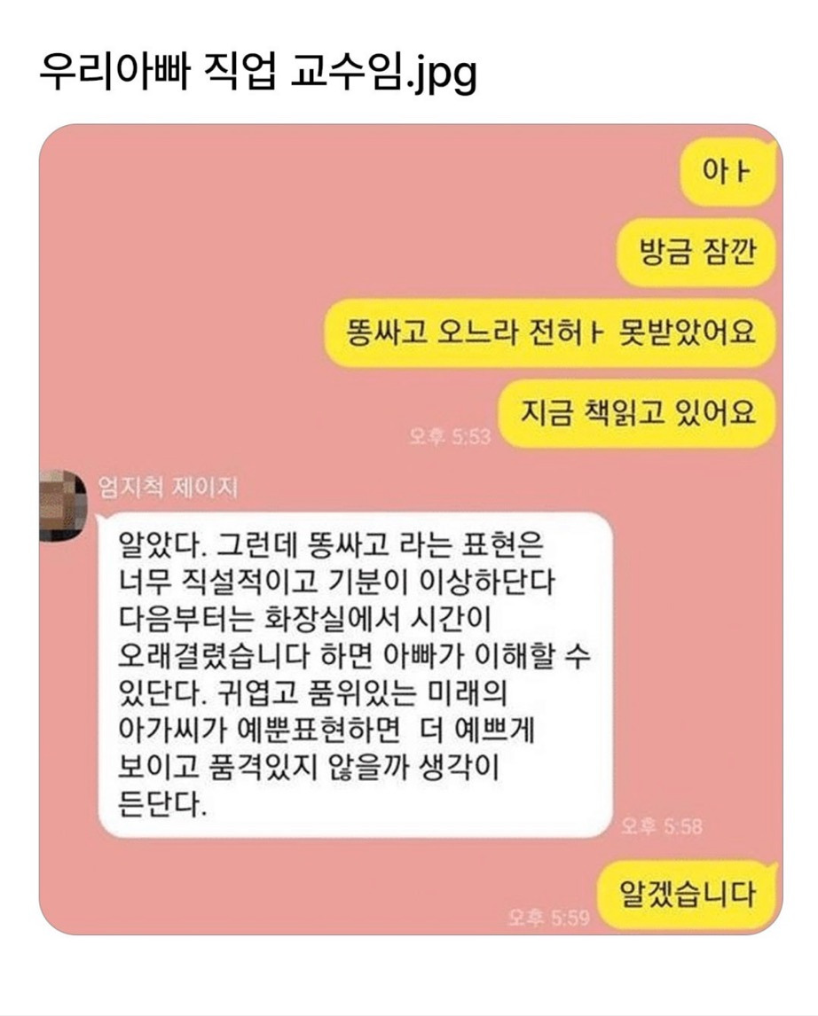 [배꼽의행방]우리 아빠 직업 교수임 작성자후이돼지|작성시간25.12.24|조회수90,061 목록 댓글 14 글자크기 작게가 글자크기 크게가 출처: 여성시대 후이돼지ㅋㅋㅋㅋㅋㅋㅋㅋㅋㅋㅋㅋㅋㅋㅋㅋㅋ 다음검색 현재 게시글 추가 기능 열기 북마크 공유하기 신고 센터로 신고 댓글 댓글 14 댓글쓰기 답글쓰기 댓글 리스트 작성자반박시 님말이 다 맞음 | 작성시간 25.12.24 마지막 아빠 부럽다 ㅋㅋ 작성자papermint | 작성시간 25.12.24 헉 어쪄냐 작성자shineonme | 작성시간 25.12.24 우리 엄마 어디서 ㅇㅇ 이거 배워 와서 ㅇ 딱 하나만 찍어서 보내 ㅜㅜ 예전엔 알겠어~ 이랬는디... 서운햐... 작성자김밥짱짱 | 작성시간 25.12.25 너굴맨 ㅋㅋㅋㅋㅅㅂ 작성자비락 | 작성시간 25.12.25 너굴맨ㅋㅋㅋㅋㅋㅋ 댓글 전체보기