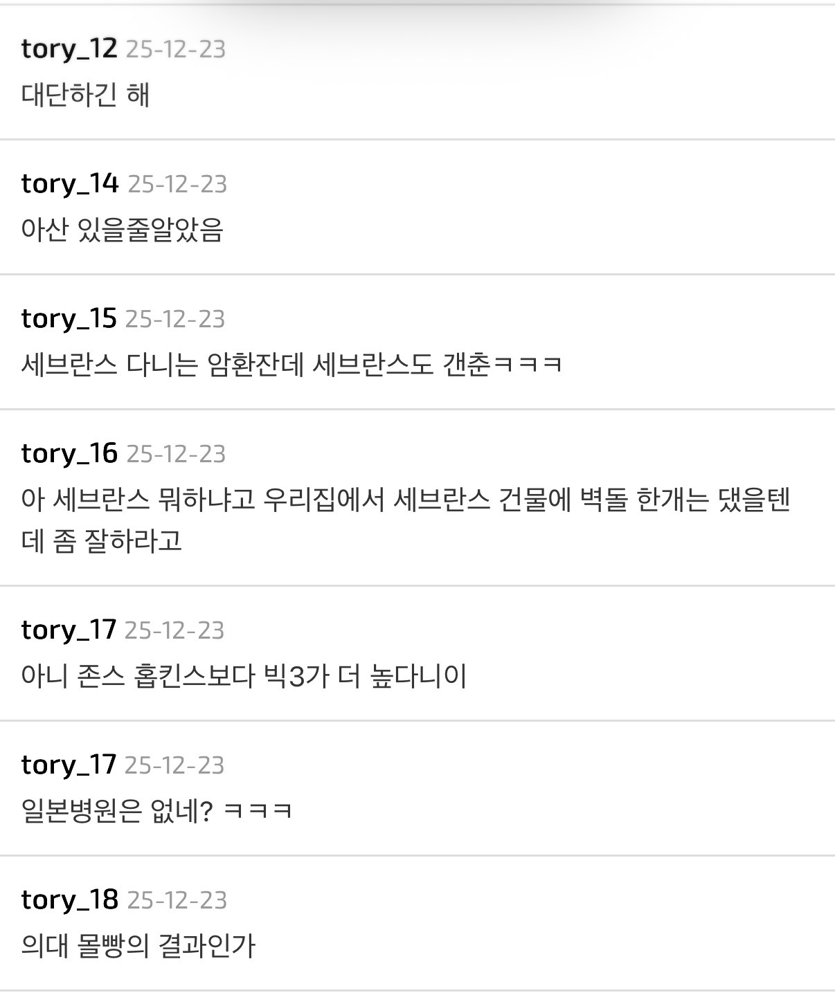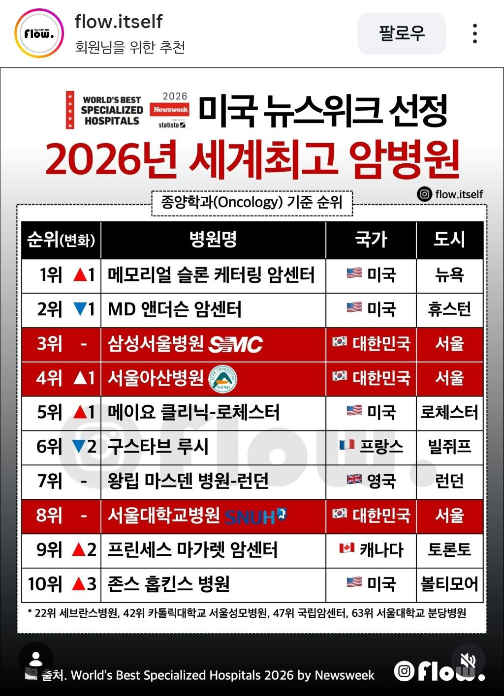[흥미돋]미국 뉴스위크 선정 세계 최고 암병원 순위.jpg 작성자돈많은백수준비생|작성시간25.12.24|조회수31,087 목록 댓글 53 글자크기 작게가 글자크기 크게가 출처: 여성시대 돈많은백수준비생https://www.dmitory.com/issue/393862457접수 검사 입원 수술 퇴원 치료까지잘 짜여있는 시스템은 우리나라가 최고인듯 다음검색 현재 게시글 추가 기능 열기 북마크 공유하기 신고 센터로 신고 댓글 댓글 53 댓글쓰기 답글쓰기 댓글 리스트 작성자좋은말로할때좋은말들어 | 작성시간 25.12.24 세브란스가 없네..! 작성자한복을입고 | 작성시간 25.12.24 헣 난 아산이 먼저인줄 ㅋㅋㅋ좋구먼 암튼 작성자The Evil Queen | 작성시간 25.12.24 난 삼성에서 성모로 옮겻어성모가 간호사랑 의사 50000배 친절함그리고 암별로 다르니 갈일있으면 꼭 알아보고가 작성자ㅁㄱㄴㄱㅇㅅ | 작성시간 25.12.25 삼성 최고 작성자진돗개 백설 | 작성시간 25.12.26 진ㅋ자대단하다 댓글 전체보기