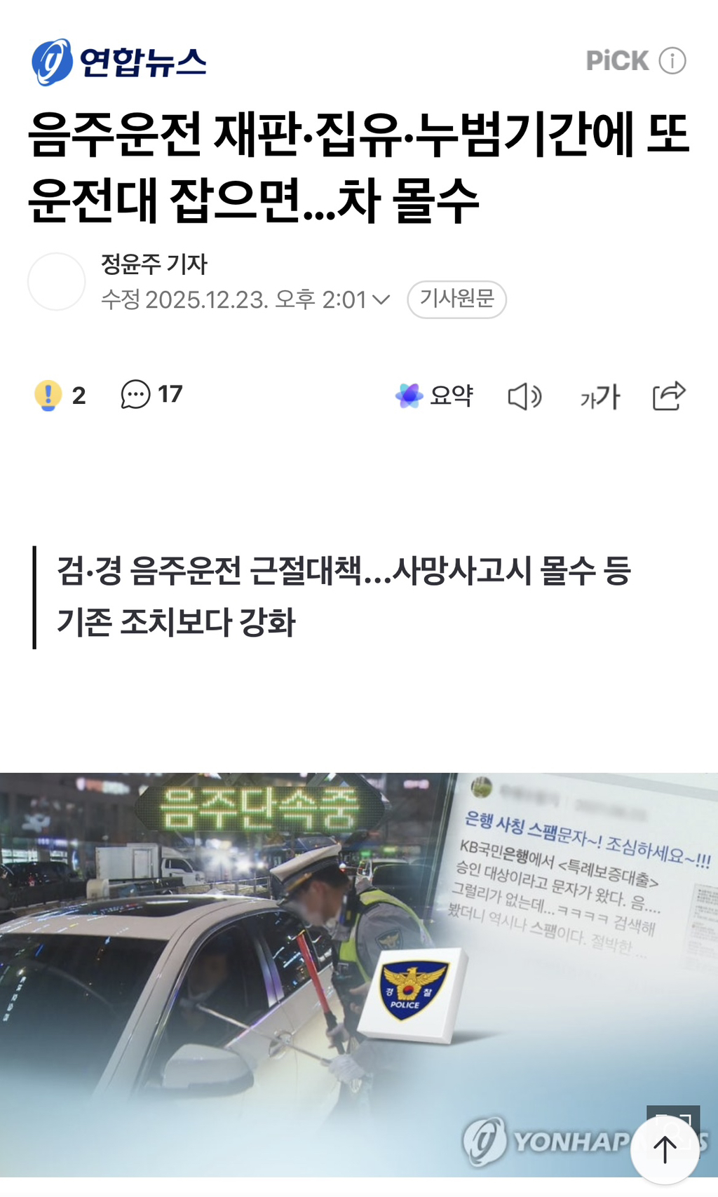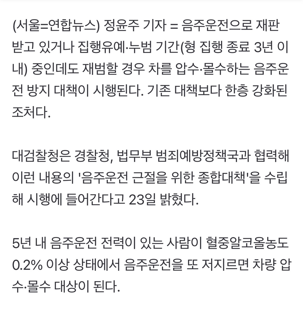 [여시뉴스데스크]음주운전 재판·집유·누범기간에 또 운전대 잡으면…차 몰수 작성자Midnight Train|작성시간25.12.24|조회수2,768 목록 댓글 12 글자크기 작게가 글자크기 크게가 출처: https://n.news.naver.com/article/001/0015810873?sid=102음주운전 재판·집유·누범기간에 또 운전대 잡으면…차 몰수검·경 음주운전 근절대책…사망사고시 몰수 등 기존 조치보다 강화 음주운전으로 재판받고 있거나 집행유예·누범 기간(형 집행 종료 3년 이내) 중인데도 재범할 경우 차를 압수·몰수하는 음주n.news.naver.com전문 출처로 다음검색 현재 게시글 추가 기능 열기 북마크 공유하기 신고 센터로 신고 댓글 댓글 12 댓글쓰기 답글쓰기 댓글 리스트 작성자나초초의레시피 | 작성시간 25.12.24 뺏어서 나 줘라 작성자그리즐리베어 | 작성시간 25.12.24 좋긴한데 초범부터 뺏었으면 좋겠다 안 할 사암은 절대 안하고 하는 사람만 계속하는거 알잖아.. 작성자고래를 타고 떠나는 여행 | 작성시간 25.12.24 아예 면허취소시켜 작성자안가네딸내미 | 작성시간 25.12.24 내가 바라는건 손모가지라고!! 작성자응용외과학 | 작성시간 25.12.24 한번이라도 걸리면 면허 취소시켜야지 댓글 전체보기
