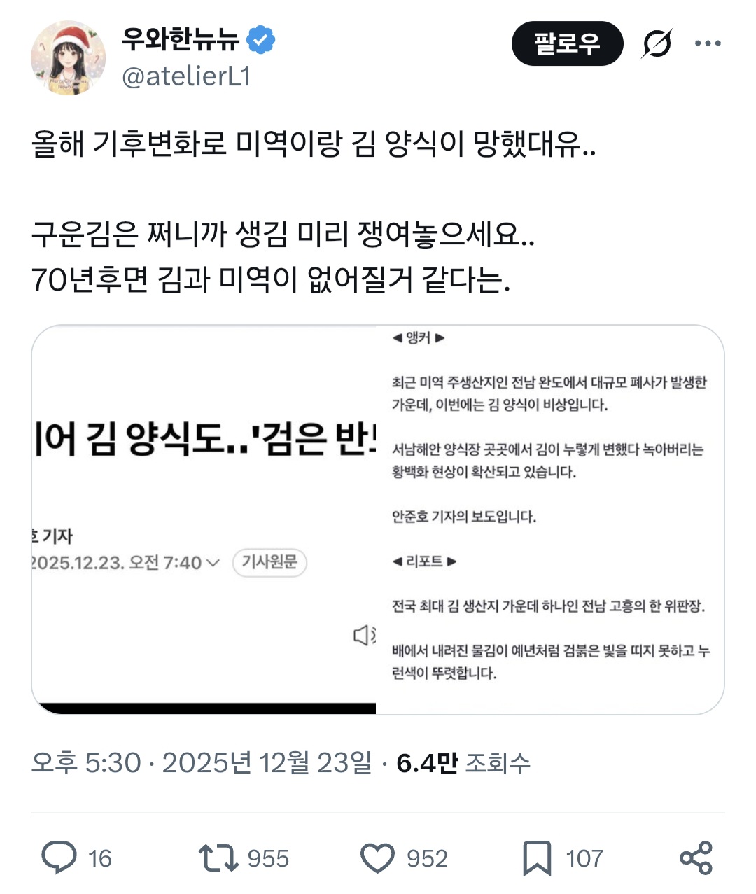 [기타]올해 기후변화로 미역이랑 김 양식이 망했대유..twt 작성자냥냥펀치°|작성시간25.12.24|조회수77,916 목록 댓글 113 글자크기 작게가 글자크기 크게가 출처: https://x.com/i/status/2003382810388910549 다음검색 현재 게시글 추가 기능 열기 북마크 공유하기 신고 센터로 신고 댓글 댓글 113 댓글쓰기 답글쓰기 댓글 리스트 작성자프라다맥파든 | 작성시간 25.12.26 ㅇㄴ돼!!!!! 작성자스테윗미 | 작성시간 25.12.26 안돼ㅁㅊ 작성자홈런볼런홈 | 작성시간 25.12.26 안돼 ㅠㅠ 작성자꿀릴리 | 작성시간 25.12.26 안돼.... 작성자저속멜1섭 | 작성시간 25.12.26 안돼ㅠㅠㅠㅠㅠㅠ 댓글 전체보기