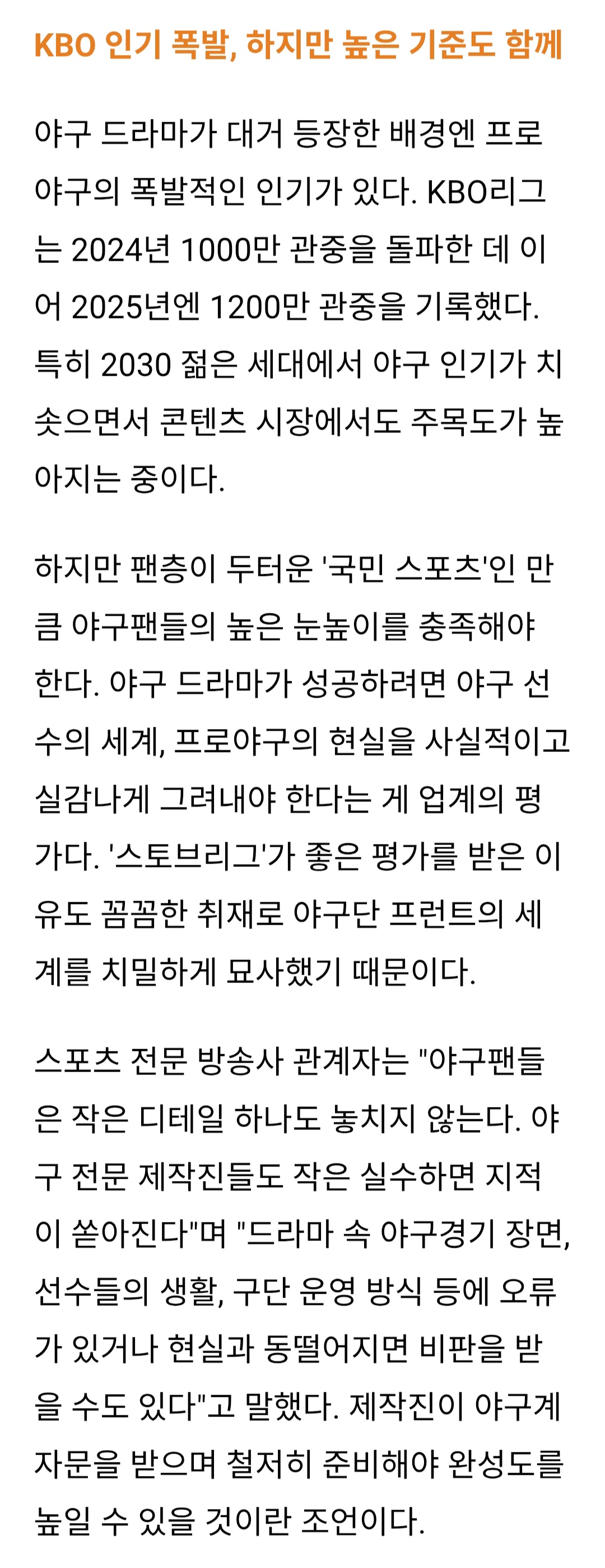 [여시뉴스데스크]2026년 '야구 드라마'가 3편이나 나온다...김우빈·한효주·김래원 등 스타 총출동 작성자COPY BARA|작성시간25.12.24|조회수6,021 목록 댓글 16 글자크기 작게가 글자크기 크게가 출처: https://www.spochoo.com/news/articleView.html?idxno=1178762026년 '야구 드라마'가 3편이나 나온다...김우빈·한효주·김래원 등 스타 총출동 [더게이트 이슈] [더게이트]2026년 안방극장에 야구 열풍이 분다. tvN, MBC, SBS 등 지상파와 케이블 채널이 앞다퉈 야구 드라마를 편성하면서, 한 해에 야구 소재 드라마 3편이 동시에 방송되는 이례적인 상황이 펼쳐www.spochoo.com 다음검색 현재 게시글 추가 기능 열기 북마크 공유하기 신고 센터로 신고 댓글 댓글 16 댓글쓰기 답글쓰기 댓글 리스트 작성자ROSALIA | 작성시간 25.12.24 백단장 돌려줘 작성자뉴진스 이글스 스파크스 | 작성시간 25.12.24 스토브리그 시즌2 내놔 작성자공룡수집가 | 작성시간 25.12.24 김우빈거만 기대되네....... 김래원은 희안하게..그냥 시놉만봐도 뻔하게 다 그려짐,,,,, 백승수 단장이나 빨리 데려와 작성자날이너무더워 | 작성시간 25.12.24 김래원...?이상하게 안보고싶네 작성자루후이 | 작성시간 25.12.24 백단장이나 내놔 댓글 전체보기