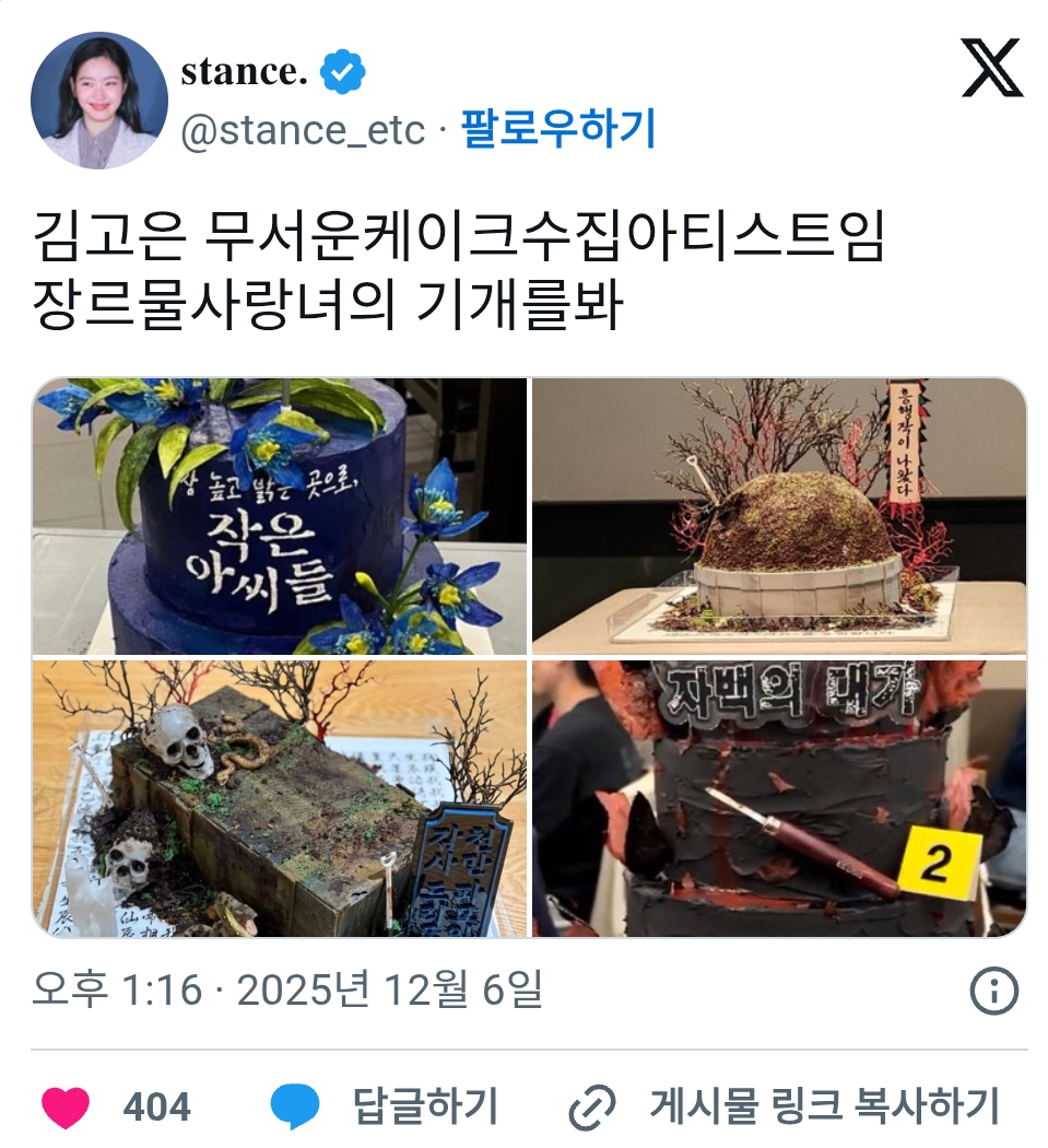 [스크랩] [흥미돋]김고은 무서운 케이크 수집 아티스트임 작성자상돈|작성시간25.12.24|조회수46,048 목록 댓글 8 글자크기 작게가 글자크기 크게가 https://x.com/stance_etc/status/1997158068388606128 다음검색 스크랩 원문 : 樂soccer 현재 게시글 추가 기능 열기 북마크 공유하기 신고 센터로 신고 댓글 댓글 8 댓글쓰기 답글쓰기 댓글 리스트 작성자쫌시원 | 작성시간 25.12.24 파묘케이크 아트다 아트 작성자구루프 | 작성시간 25.12.24 파묘 너무무서운데요ㅠ 작성자이재몀 | 작성시간 25.12.24 와... 작성자반찬콩 | 작성시간 25.12.24 파묘 ㅣㅋㅋㅋㅋㅋ쿠ㅜㅜ 파먹으면 안에 뭐 있을거 같음ㅋㅋㅜㅜ 작성자범죄자반갈죽 | 작성시간 25.12.25 셋다 진짜 재밋게봄 고은😘 댓글 전체보기