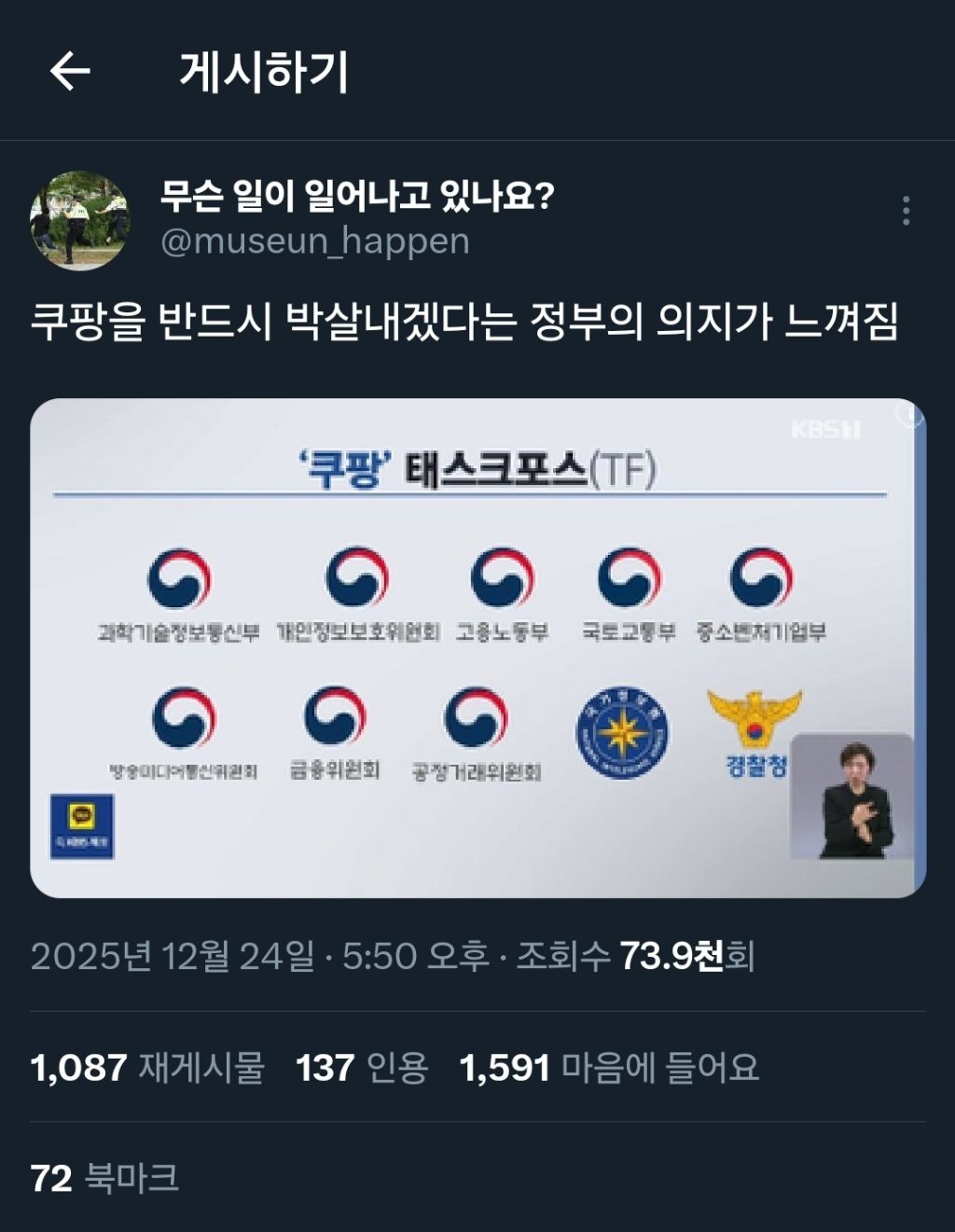 [흥미돋]쿠팡을 반드시 박살내겠다는 정부의 의지가 느껴짐.jpg 작성자guguru_ww|작성시간25.12.24|조회수41,361 목록 댓글 161 글자크기 작게가 글자크기 크게가 출처: https://x.com/i/status/2003750098925502536 다음검색 현재 게시글 추가 기능 열기 북마크 공유하기 신고 센터로 신고 댓글 댓글 161 댓글쓰기 답글쓰기 댓글 리스트 작성자이리일디 | 작성시간 25.12.26 쿠팡 뒤져 작성자딸기약 해열제같은 | 작성시간 25.12.26 응원함 작성자박도톨 | 작성시간 25.12.26 작성자끌어올려폼 | 작성시간 25.12.26 앱만 지우고 까먹고있다가 탈퇴까지 하고옴! 정부 화이팅 작성자빨간 겨울 | 작성시간 25.12.26 없애 댓글 전체보기