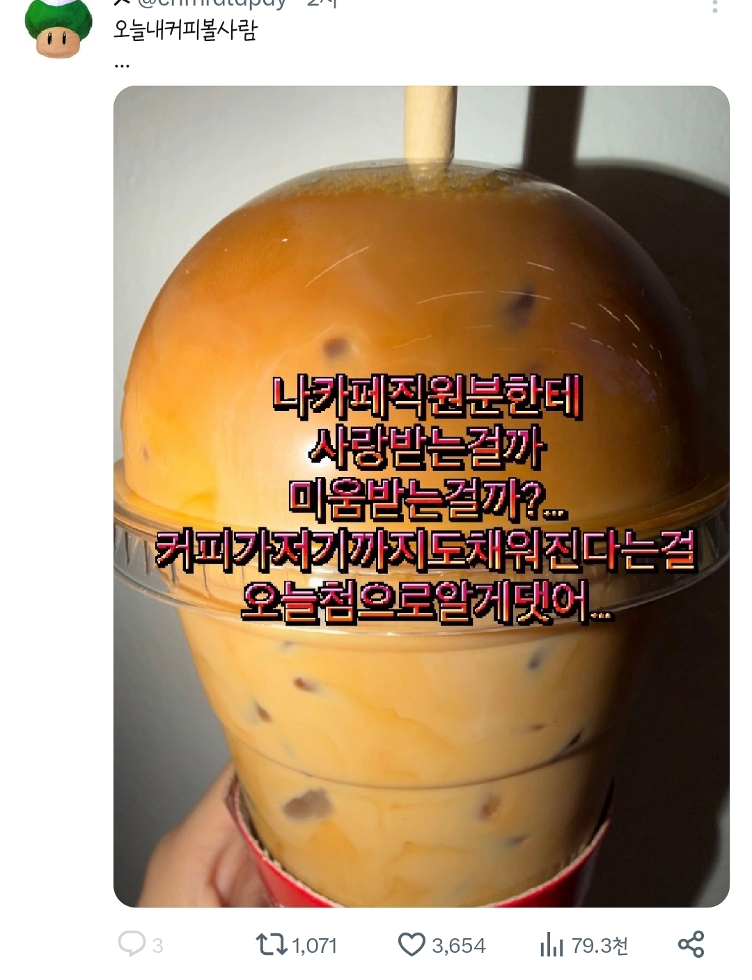 [흥미돋]카페 직원분한테 사랑받는건지 미움받는건지 긴가민가 하게 만드는...twt 작성자카이지|작성시간25.12.24|조회수60,257 목록 댓글 32 글자크기 작게가 글자크기 크게가 출처: https://twitter.com/chfhrdldpdy/status/2003743200511688860?t=f0xdAfAqwAtpGG3wzmb5rQ&s=19https://twitter.com/chfhrdldpdy/status/2003743200511688860?t=f0xdAfAqwAtpGG3wzmb5rQ&s=19 다음검색 현재 게시글 추가 기능 열기 북마크 공유하기 신고 센터로 신고 댓글 댓글 32 댓글쓰기 답글쓰기 댓글 리스트 작성자맛나요베이글 | 작성시간 25.12.24 싱거워지는 거 아냐? 작성자Hell Angel | 작성시간 25.12.24 사랑 작성자망치로한남뚝배기 | 작성시간 25.12.24 청혼임 작성자설ving | 작성시간 25.12.24 청첩장 언제 주시나요 작성자흉부와 놀부 | 작성시간 25.12.24 2ㄴ사랑 댓글 전체보기