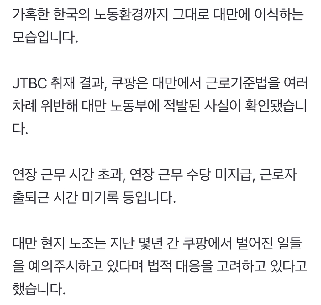 [여시뉴스데스크][단독] 대만 쿠팡서도 '초과 근무' '직원 사망'까지…한국 판박이 경영 작성자소리앙|작성시간25.12.24|조회수7,440 목록 댓글 3 글자크기 작게가 글자크기 크게가 출처: https://naver.me/5zXP0Mt1[단독] 대만 쿠팡서도 '초과 근무' '직원 사망'까지…한국 판박이 경영한국에서 대규모 개인정보 유출 사태가 벌어지는 동안, 대만에서 적극적인 사업 확장에 나서고 있던 쿠팡. 가혹한 한국의 노동환경까지 그대로 대만에 이식하는 모습입니다. JTBC 취재 결과, 쿠n.news.naver.com전문출처 다음검색 현재 게시글 추가 기능 열기 북마크 공유하기 신고 센터로 신고 댓글 댓글 3 댓글쓰기 답글쓰기 댓글 리스트 작성자간접조명 | 작성시간 25.12.24 이렇게 계속 사람 죽어나가는 기업도 참.... 작성자ㅍㅎㅊㅊㄹ | 작성시간 25.12.24 안쓴다 작성자MEENOI | 작성시간 25.12.24 동북아는 근무형태가 왜 다 이따구냐.. 댓글 전체보기