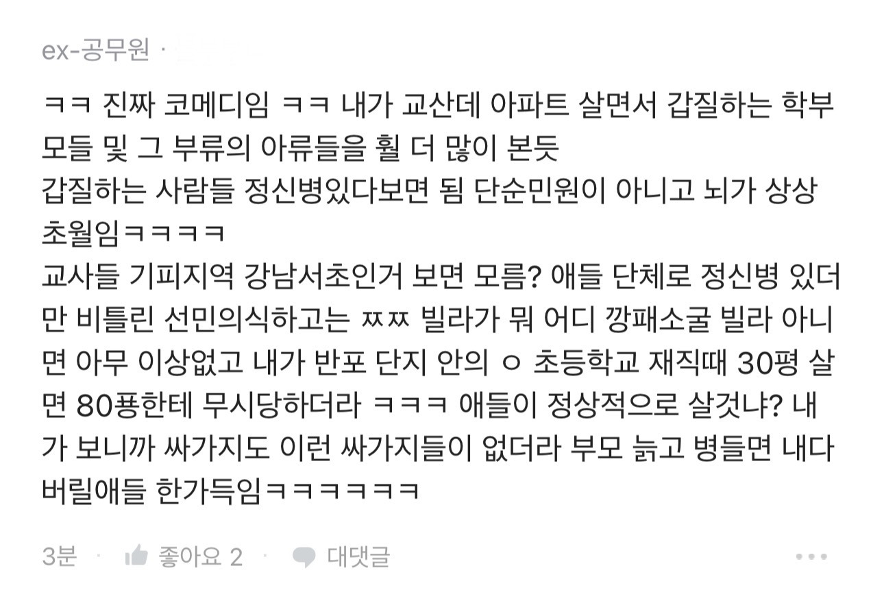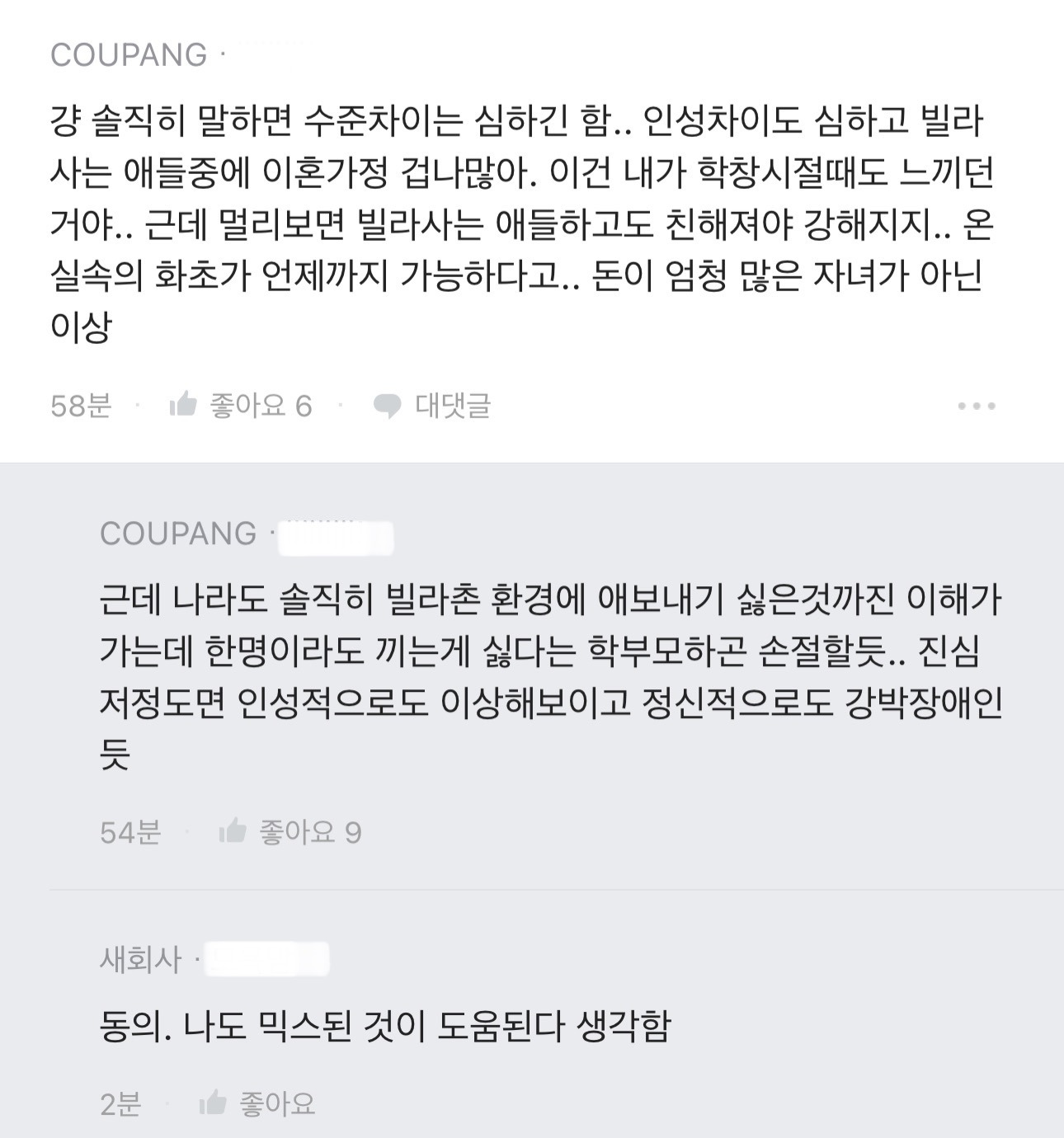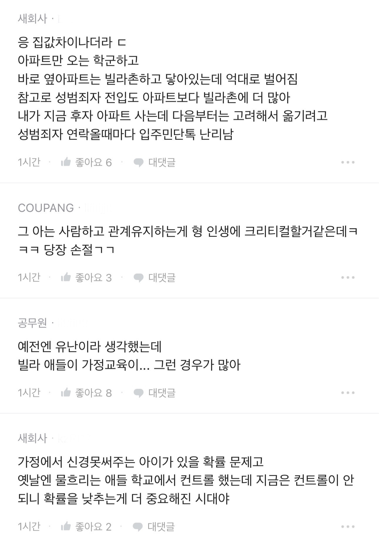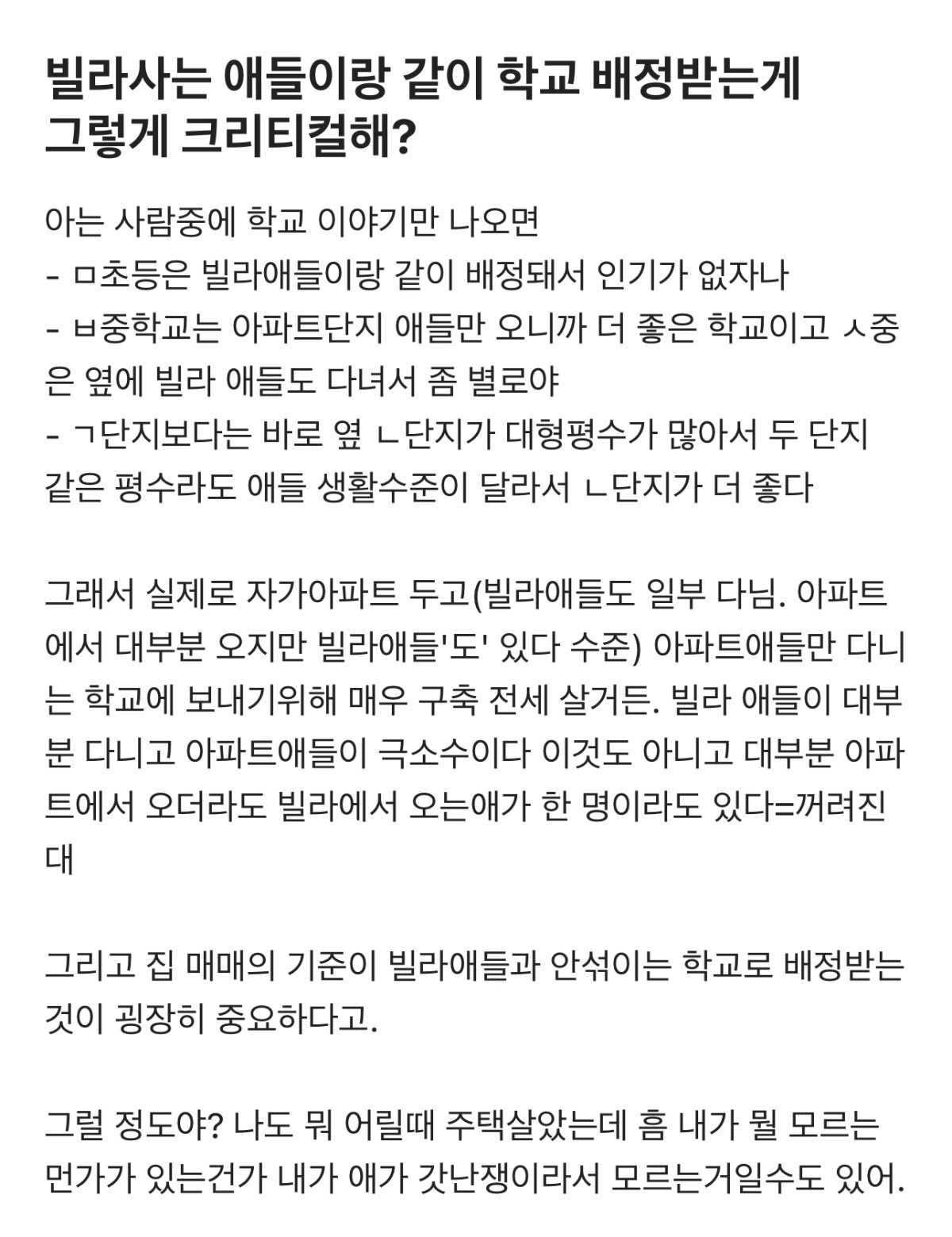 작성자루이테니우라 작성시간 25.12.25 이게 아파트랑 빌라로 나누다보니까 동네마다 상황이 달라서 의견이 갈라지는 듯... 솔직히 학군 개중요함.... 어울리는 친구에 따라서 시야가 달라질수밖에 없더라 ㅠㅠ 나같아도 기왕이면 좋은곳 보내고 싶으니까 학군 좋고 비싼동네로 보낼듯