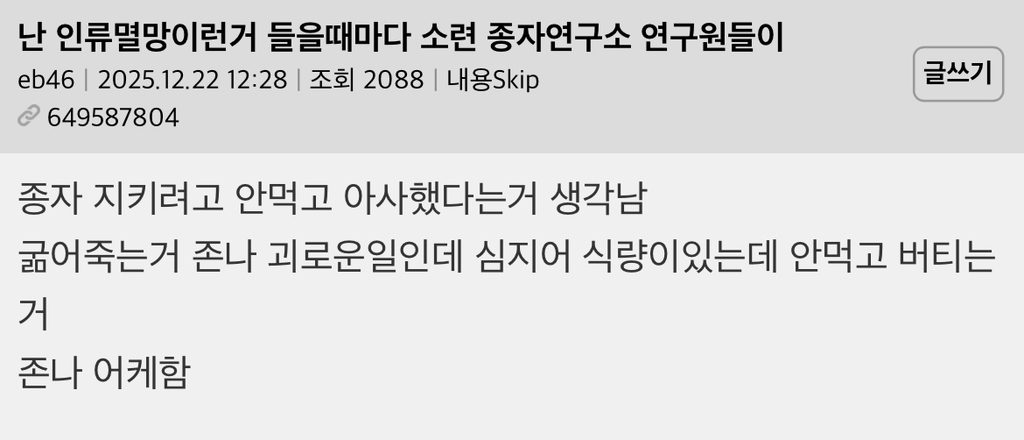 [흥미돋]난 인류멸망이런거 들을때마다 소련 종자연구소 연구원들이 작성자MoMAA|작성시간25.12.25|조회수39,494 목록 댓글 24 글자크기 작게가 글자크기 크게가 출처: https://hygall.com/649587804 다음검색 현재 게시글 추가 기능 열기 북마크 공유하기 신고 센터로 신고 댓글 댓글 24 댓글쓰기 답글쓰기 댓글 리스트 작성자이채형 | 작성시간 25.12.25 ㅠㅠ 작성자맴맴냥 | 작성시간 25.12.25 고귀하다고 느껴질 정도다.. 눈물나려고 함 작성자눈을왜부라리 | 작성시간 25.12.25 뭔가 후한이 두렵다거나..그런 압박같은게 있었던거 아냐?ㅜ 작성자천년의노래 | 작성시간 25.12.25 우와 사명감만으로 가능한 일인가 진짜 대단하다 나는 절대 못할듯ㅜㅜㅋㅋ 작성자꺄압 | 작성시간 25.12.25 하.. 댓글 전체보기