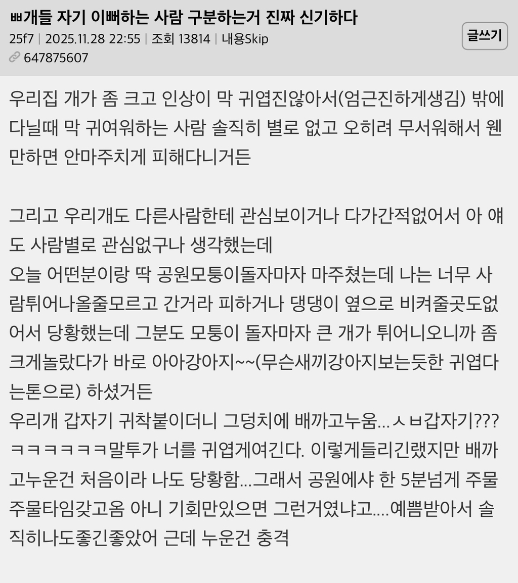 작성자여름에썬크림꼭바르기 작성시간 25.12.25 나도 저런적있엌ㅋㅋ 길가다 마주쳐서 어머! 했는데 바로 배까더라고 그래서 긁긁해줌ㅋㅋㅋㅋ 진도? 같았는데 바로 벌러덩하니까 주인분이 당황해하셨었어ㅋㅋㅋㅋ