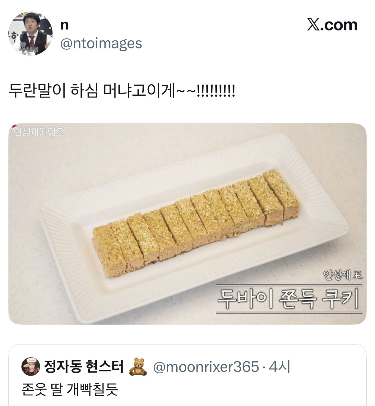 [배꼽의행방]@: 안성재 두쫀쿠가 아니라 두란말이 해서 딸 개빡침 작성자nero|작성시간25.12.25|조회수33,312 목록 댓글 83 글자크기 작게가 글자크기 크게가 출처: https://x.com/moonrixer365/status/2003799817819206071?s=46X의 정자동 현스터 🧸님(@moonrixer365)존웃 딸 개빡칠듯x.com안성재표 두바이 쫀득 쿠키 ㅋㅋ!! 다음검색 현재 게시글 추가 기능 열기 북마크 공유하기 신고 센터로 신고 댓글 댓글 83 댓글쓰기 답글쓰기 댓글 리스트 작성자미니미니미니 | 작성시간 25.12.25 아빠 ㅜㅜ 이거 아니야 ㅠㅠㅠ 이건 두란말이잖아.. 작성자안녕허손요 | 작성시간 25.12.25 아 ㅈㄴ 웃긴닼ㅋㅋㅋㅋㅋㅋㅋㅋㅋㅋㅋㅋ 작성자NOMADE | 작성시간 25.12.25 두란말이 미치것다ㅠㅠㅋㅋㅋㅋㅋㅋㅋㅋㅋㅋ 작성자홍할속의콩매 | 작성시간 25.12.26 하.. 작성자입술뜯기중독자 | 작성시간 25.12.26 거덩요 ㅋㅋㅋㅋㅋㅋㅋㅋ 댓글 전체보기