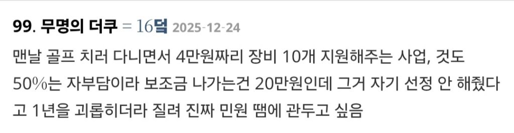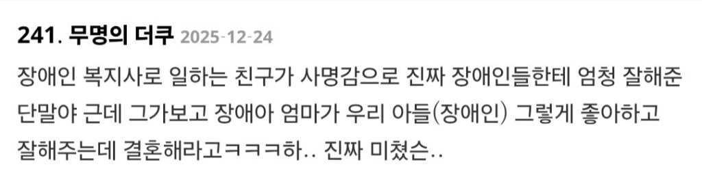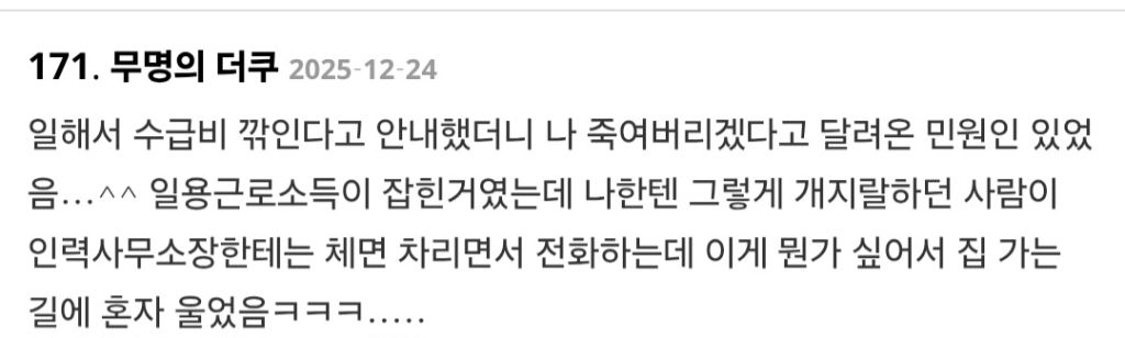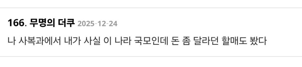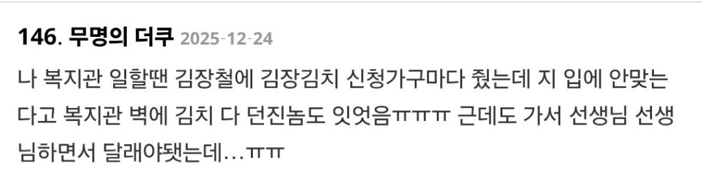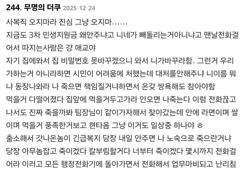 작성자어미냥과 아이덜 작성시간 25.12.27 나도 사회복지 공무원인데 정부양곡 계좌이체 걸어달라는 질문 진짜 많이 들음...은행 가서 하라고 하면 여기서 해달라고 우기는데 그런사람들이 한둘이 아니라서 미쳐버릴거같아