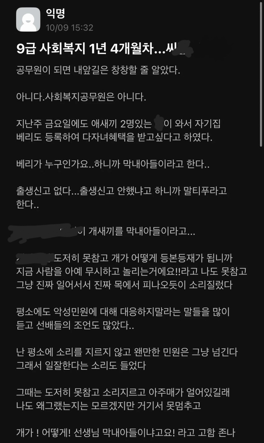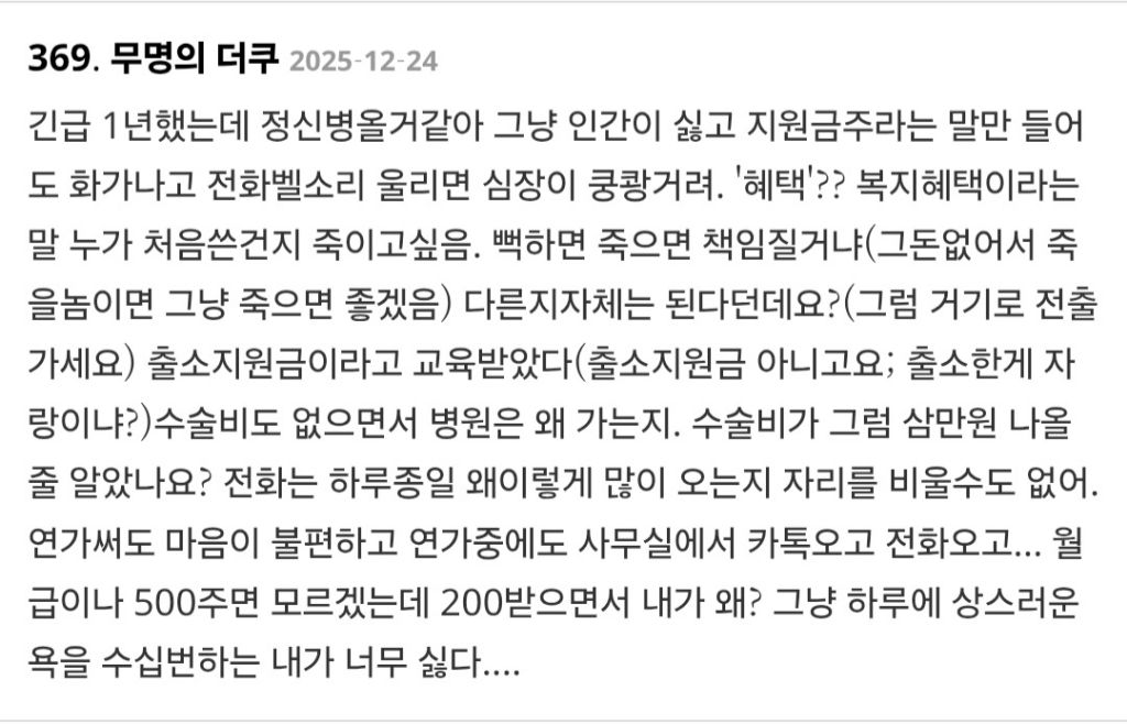 답댓글 작성자어미냥과 아이덜 작성시간 25.12.27 근데 힘들고 인류애 상실할 때가 대부분이지만 가끔씩 보람도 있어. 기초연금 신청하러 온 사람인데 힘들어 보여서 상담하다가 수급자 신청도 같이 해줘서 수급자 됐을 때, 수급자 돼서 얼굴 좋아져서 다시 올 때 등등...난 사복 공무원 무조건 비추는 안함...