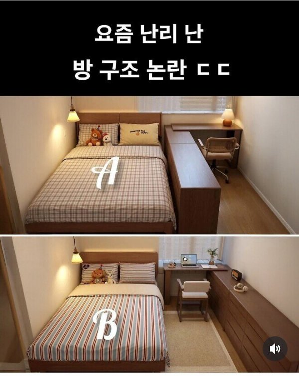 [흥미돋]반반갈린다는 방구조 취향 작성자우주여시|작성시간25.12.25|조회수16,823 목록 댓글 56 글자크기 작게가 글자크기 크게가 출처: 여성시대 우주여시 다음검색 현재 게시글 추가 기능 열기 북마크 공유하기 신고 센터로 신고 댓글 댓글 56 댓글쓰기 답글쓰기 댓글 리스트 작성자가감감 | 작성시간 25.12.25 b는 공부못함 작성자baijingting | 작성시간 25.12.25 b 작성자띠리리 | 작성시간 25.12.25 원룸은 a가 좋던데 집좀 커지니까 b 작성자전복솥빱 | 작성시간 25.12.25 Bbbb 작성자족졔비 | 작성시간 25.12.25 나는 갬성 살린다고 A를 고르지만 엄마가 정리도 안되면서 서랍장 위에 뭘 또 줄렁줄렁 전시해놓을거냐고 면박주며 B로 하라고 잔소리할거같음 댓글 전체보기