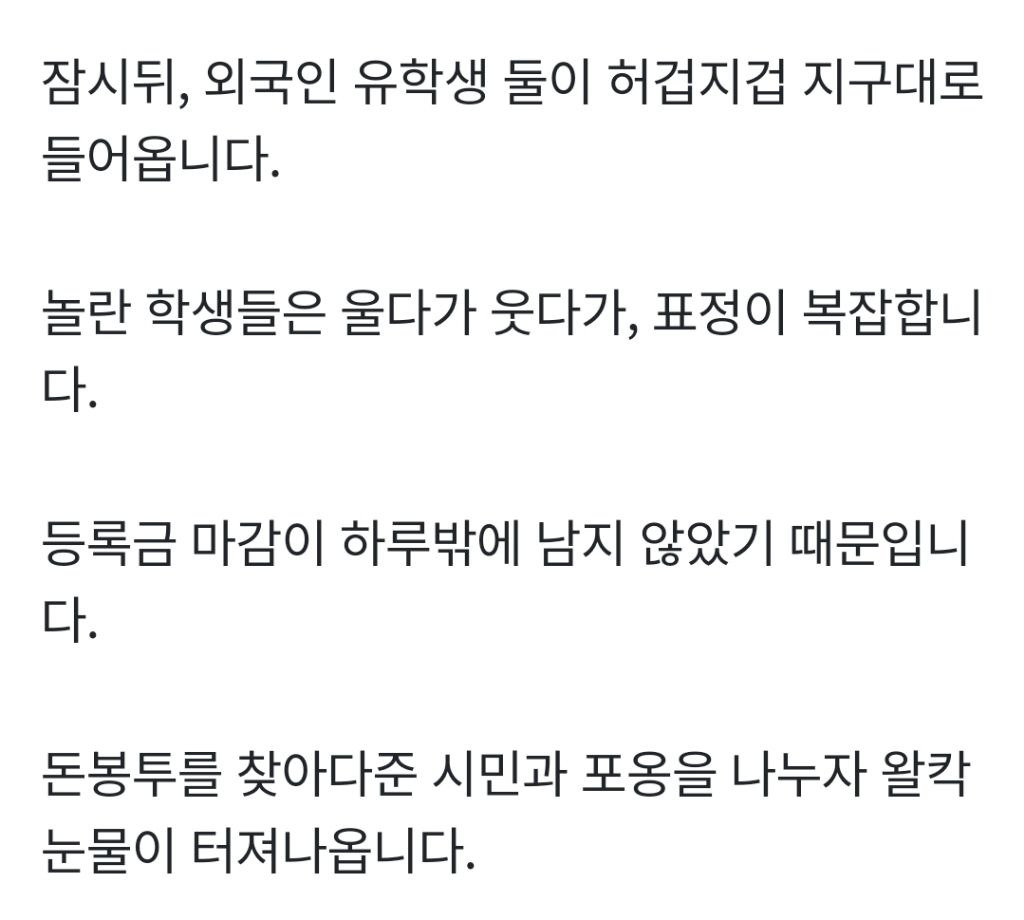 [흥미돋]잃어버린 대학 등록금 봉투 찾고 눈물 터 진 외국인 유학생 꼬옥 안아주는 시민 작성자라이도|작성시간25.12.25|조회수27,463 목록 댓글 17 글자크기 작게가 글자크기 크게가 출처: 여성시대 라이도 다음검색 현재 게시글 추가 기능 열기 북마크 공유하기 신고 센터로 신고 댓글 댓글 17 댓글쓰기 답글쓰기 댓글 리스트 작성자문오언. | 작성시간 25.12.25 외 저릃 욼리싢아요 ㅠ 작성자내향형조권 | 작성시간 25.12.25 저 어릴때 맘이 뭔지아니까 다들 공감하는 거 같아 ㅋㅋ ㅠㅠ 작성자난여전히같은마음이니까 | 작성시간 25.12.25 나 왜 눈물나요ㅠㅠ 작성자삼성전자이재용회장이내아빠였으면좋 | 작성시간 25.12.25 인류애충전 ㅠㅠ 작성자왜그러니 | 작성시간 25.12.25 아 눈물나 댓글 전체보기
