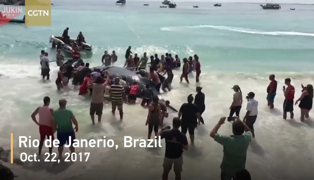 주변의 관광객 30여 명이 힘을 모아 고래를 돌려보내는 데 성공합니다.