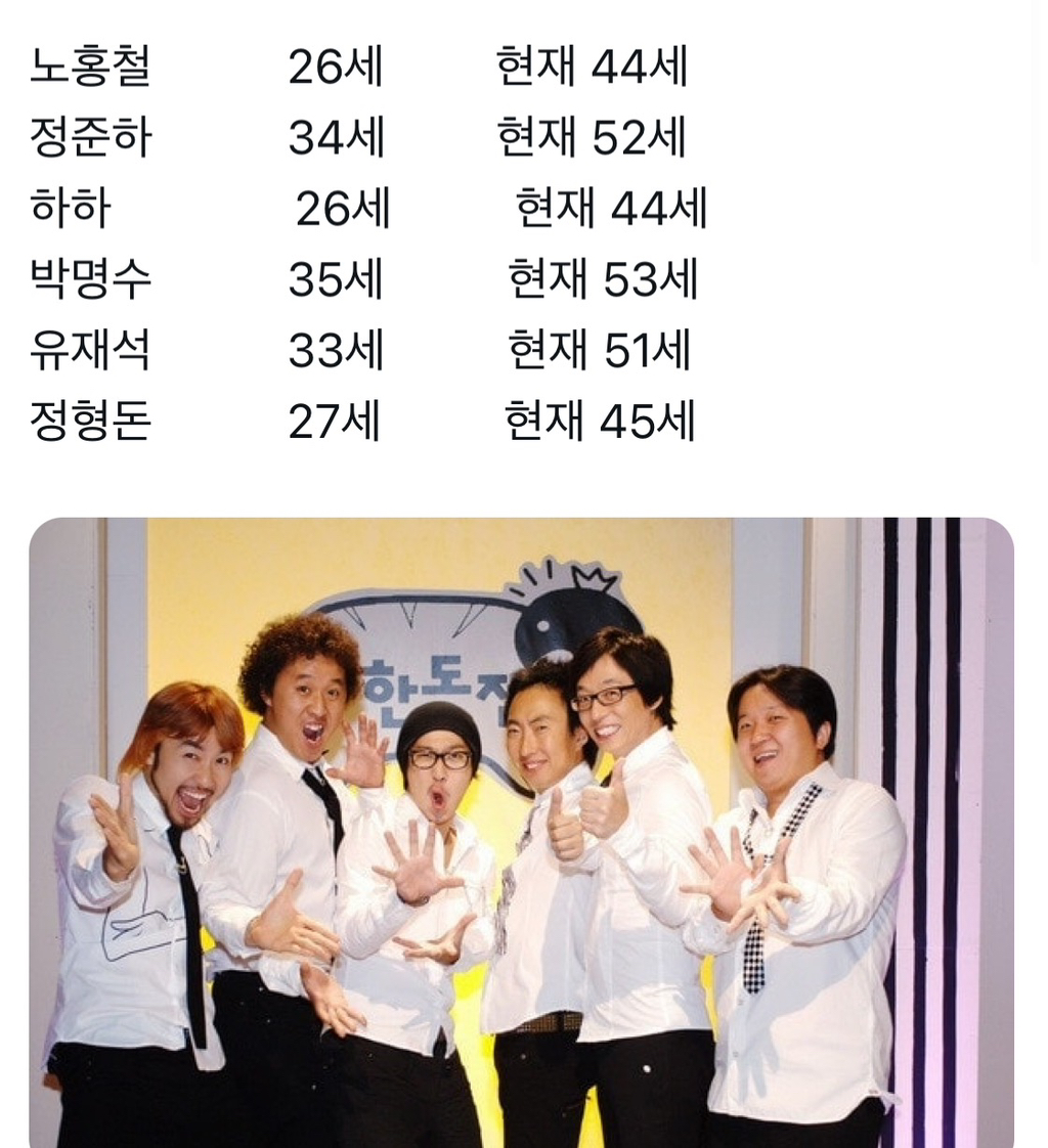 [스크랩] [흥미돋]무한도전 멤버들 과거, 현재 나이 작성자토개피개비|작성시간25.12.25|조회수6,760 목록 댓글 10 글자크기 작게가 글자크기 크게가 출처 : https://twitter.com/mudo_clip_video/status/1676526824971726849?s=46&t=0XukwA0AiHu96sF7EP10mQ 다음검색 스크랩 원문 : *여성시대* 차분한 20대들의 알흠다운 공간 현재 게시글 추가 기능 열기 북마크 공유하기 신고 센터로 신고 댓글 댓글 10 댓글쓰기 답글쓰기 댓글 리스트 작성자가지가지한다가지가지해 | 작성시간 25.12.25 헉 박명수가 35세...완전아저씨라 생각했는데..아니 35세가 아저씨긴한데 45세쯤으로 봄 작성자우유왕자 | 작성시간 25.12.25 내가.. 명수..? 작성자귀가 | 작성시간 25.12.25 와... 저렇게 어렸다고..??? 작성자노력만이 살길 | 작성시간 25.12.25 내가 명수..? 작성자왕만두최애 | 작성시간 25.12.25 내가..? ...? 댓글 전체보기
