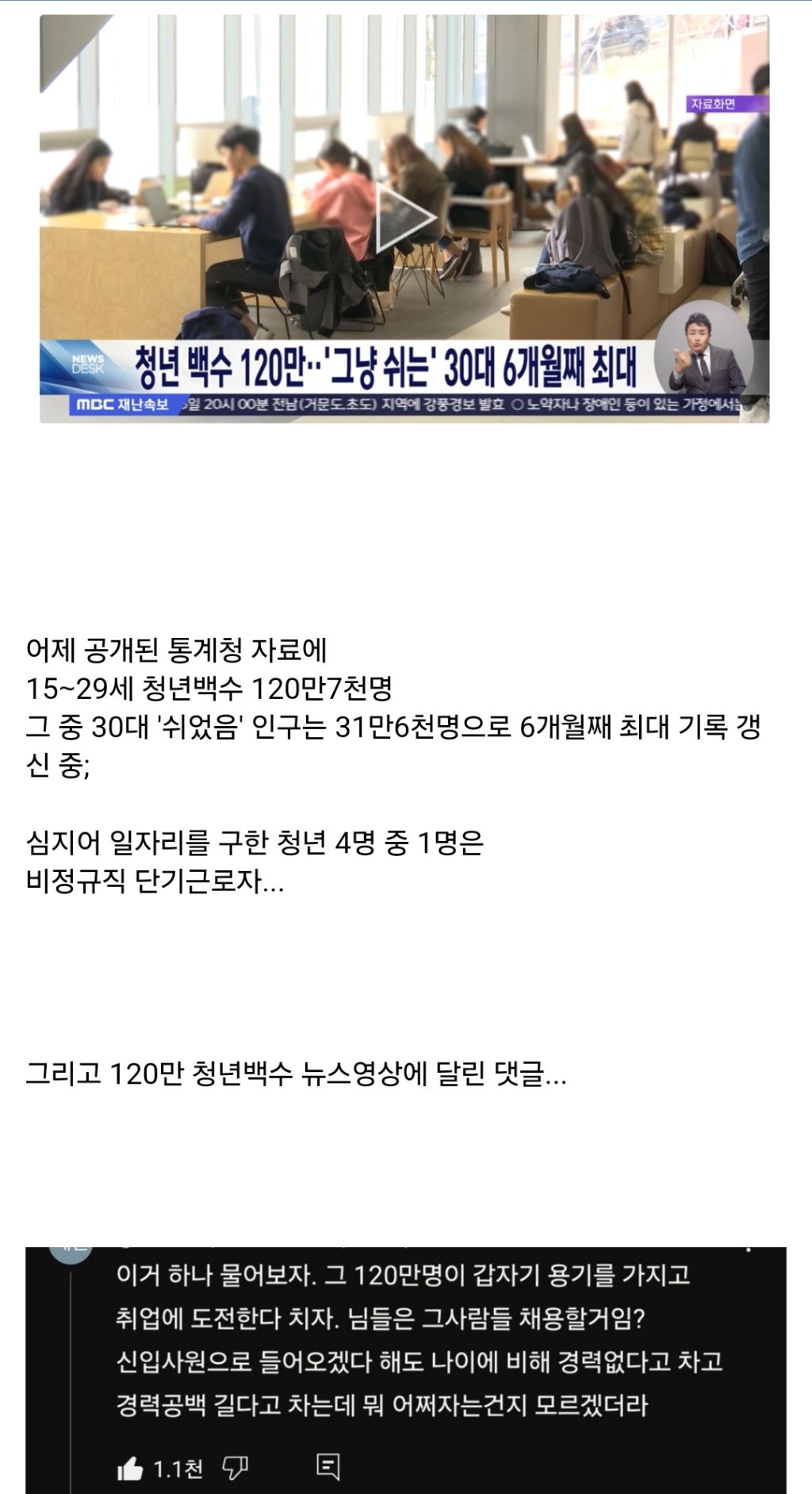 솔직히 이런 뉴스 나와봐야 청년들은 누구보다 몸으로 체감하고 있고 나같은 사람이 한둘이 아니구나 싶어서 무력함만 어마무지하게 커짐