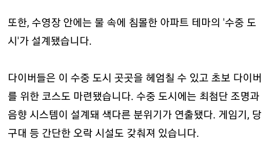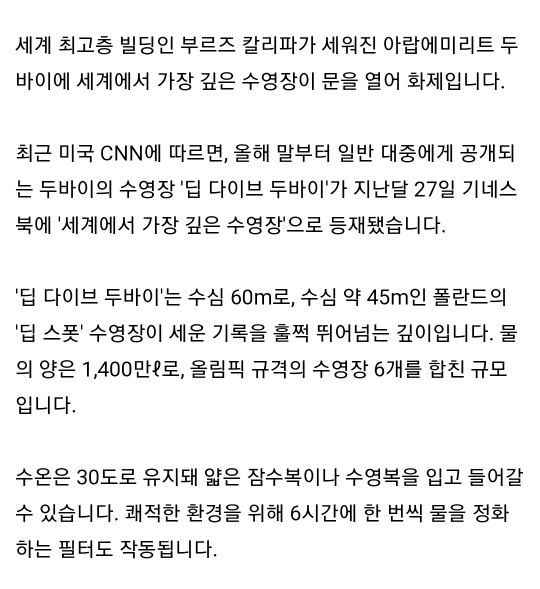 [스크랩] [흥미돋]두바이, 세계에서 가장 깊은 수영장 '딥 다이브 두바이' 개장 작성자080868|작성시간25.12.25|조회수50,789 목록 댓글 45 글자크기 작게가 글자크기 크게가 출처 : https://www.google.com/amp/s/m.mbn.co.kr/news-amp/4550147[영상] 두바이, 세계에서 가장 깊은 수영장 '딥 다이브 두바이' 개장세계 최고층 빌딩인 부르즈 칼리파가 세워진 아랍에미리트 두바이에 세계에서 가장 깊은 수영장이 문을 열어 화...www.mbn.co.kr 다음검색 스크랩 원문 : *여성시대* 차분한 20대들의 알흠다운 공간 현재 게시글 추가 기능 열기 북마크 공유하기 신고 센터로 신고 댓글 댓글 45 댓글쓰기 답글쓰기 댓글 리스트 작성자외게롱 | 작성시간 25.12.26 와 챔버까지 있다고 나도 초청해라 작성자일본의 빠른 대지진을 기원합니다! | 작성시간 25.12.26 다이빙 안한지 오래 되었는데 두바이 한번가서 다이빙하고 싶다 멋지네 작성자맛집찾아 삼만리 | 작성시간 25.12.26 우와 대박 가보고싶어 작성자구월사아일 | 작성시간 25.12.26 이거 다녀오신분 후기 봤는데 가격대비 너무별로라는 평있더라 작성자fresh jeans | 작성시간 25.12.26 우와 진짜 재밌겠다 댓글 전체보기