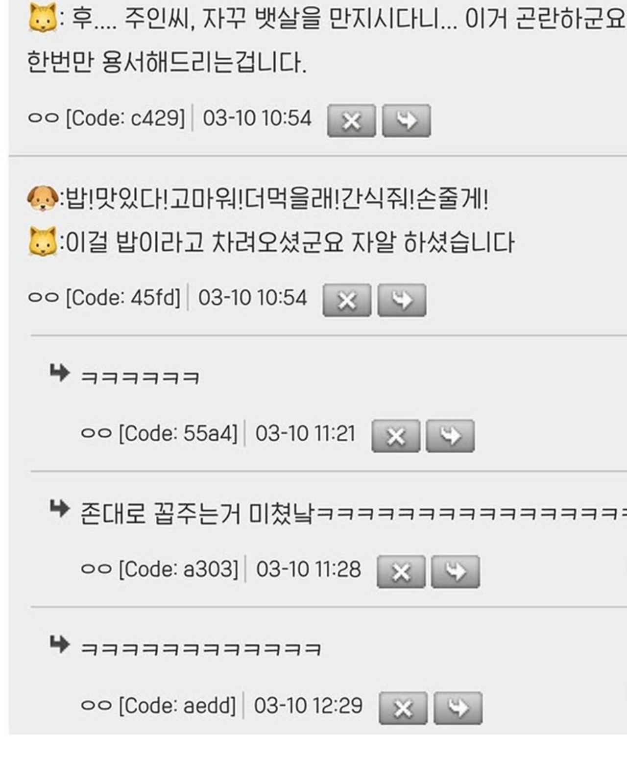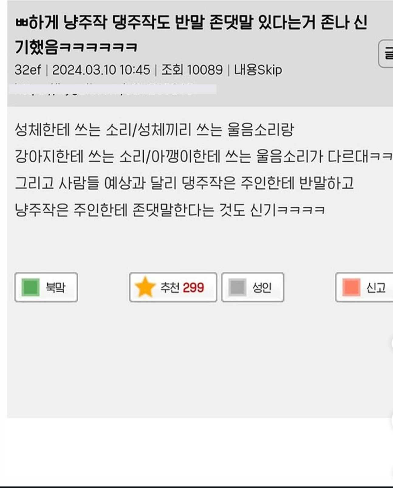 작성자굴쿤용 작성시간 25.12.26 냥이 지들끼린 이앍!!!웨에ㅔ에에ㅔㅔ에에엑...우우어ㅓㅓㅓㅓㅓㅓ 이러먄서 사람한테는 먕! 우루룽! 무야..옹.. 이러잖앝ㅋㅋㅋㅋㅋㅋㅋ