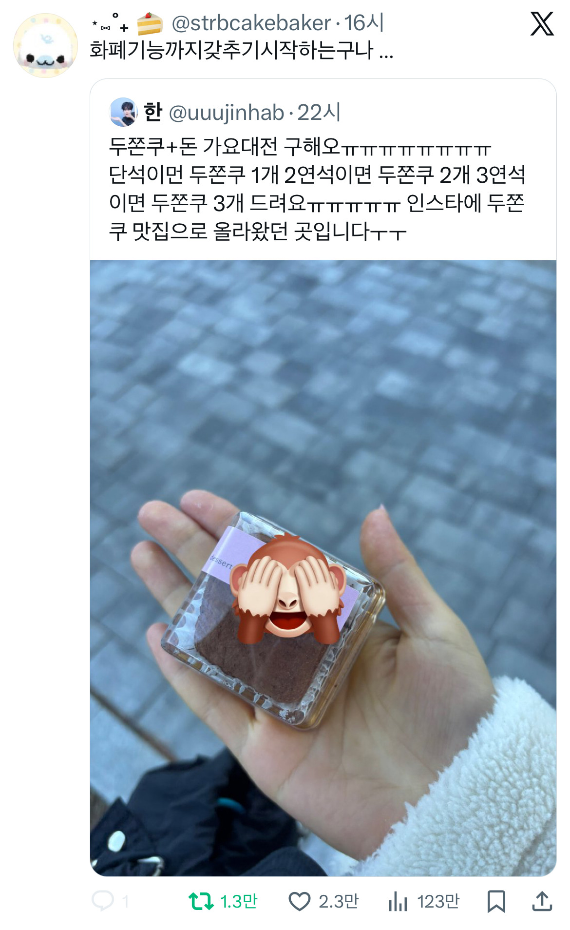[흥미돋]두쫀쿠...화폐기능까지 갖추기 시작하는구나 …twt 작성자Egypt|작성시간25.12.26|조회수64,570 목록 댓글 33 글자크기 작게가 글자크기 크게가 출처: https://x.com/strbcakebaker/status/2004123431126946238?s=46 ㅋㅋㅋㅋㅋㅋㅋㅋㅋ 다음검색 현재 게시글 추가 기능 열기 북마크 공유하기 신고 센터로 신고 댓글 댓글 33 댓글쓰기 답글쓰기 댓글 리스트 작성자문오언. | 작성시간 25.12.26 아 졸라귀엽닼ㅋㅋㅋㅋㅋㅋ 작성자러블리홍시 | 작성시간 25.12.26 ㅅㅂ미치겟닼ㅋㅋㅋㅋㅋㅋㅋㅋㅋㅋ 작성자따거따거 | 작성시간 25.12.26 너무웃김ㅋㅋㅋㅋㅋ 단석=1djc 작성자꽃부니 | 작성시간 25.12.26 ㄱㅇㅇ ㅋㅋㅋㅋㅋㅋㅋㅋㅋㅋㅋㅋㅋㅋㅋㅋㅋㅋㅋㅋㅋㅋㅋㅋ 작성자글쎄욤 | 작성시간 25.12.26 갸귀엽다ㅜㅋㅋㅋㅋ 댓글 전체보기