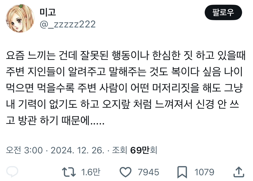 [스크랩] [흥미돋]요즘 느끼는 건데 잘못된 행동이나 한심한 짓 하고 있을때 주변 지인들이 알려주고 말해주는 것도 복이다 싶음.twt 작성자Tory-|작성시간25.12.26|조회수10,128 목록 댓글 19 글자크기 작게가 글자크기 크게가 다음검색 스크랩 원문 : 쭉빵카페 현재 게시글 추가 기능 열기 북마크 공유하기 신고 센터로 신고 댓글 댓글 19 댓글쓰기 답글쓰기 댓글 리스트 작성자Clear&Clean | 작성시간 25.12.26 불법 아닌 이상 이래라 저래라 하는 게 어렵긴 해…아무리 사랑하눈 친구라도 남의 인생이라? 작성자용호초로나온나씨뱅아 | 작성시간 25.12.26 진심... 작성자족졔비 | 작성시간 25.12.26 그래서 최근에 두놈 끊음 ㅎㅎ 그렇게 살아!! 작성자JLPT | 작성시간 25.12.26 개공감 굳이 에너지 안쓰게됨 귀찮.. 작성자콩백설기 | 작성시간 25.12.27 진짜 맞아.. 댓글 전체보기