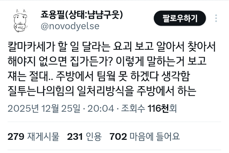 작성자꿈꾸는정원 작성시간 26.01.01 팀으로는 절대 뭐 못할 칼마 ㅋㅋ
