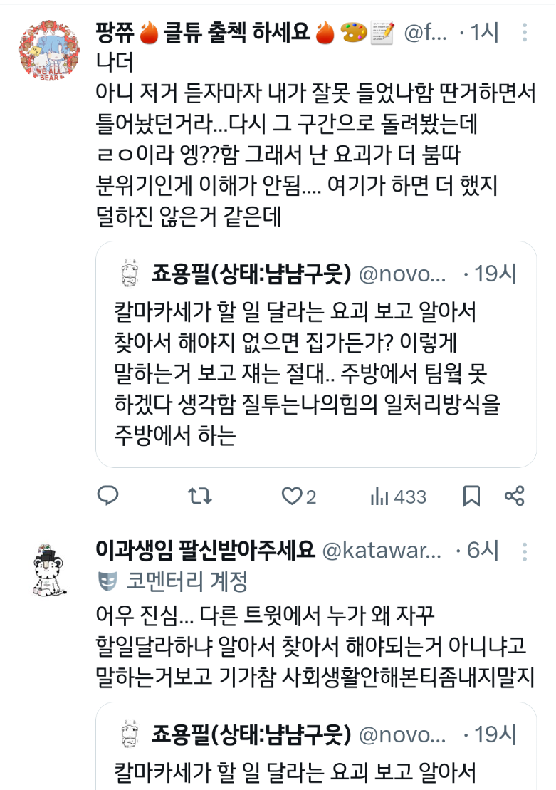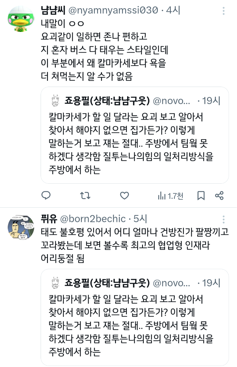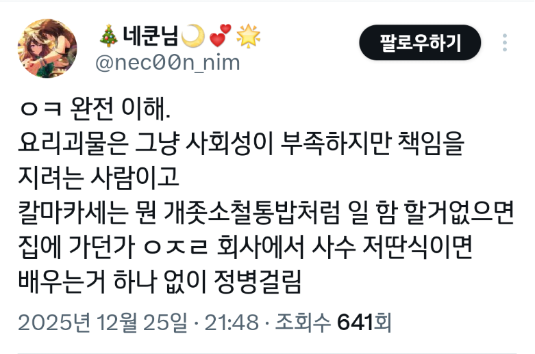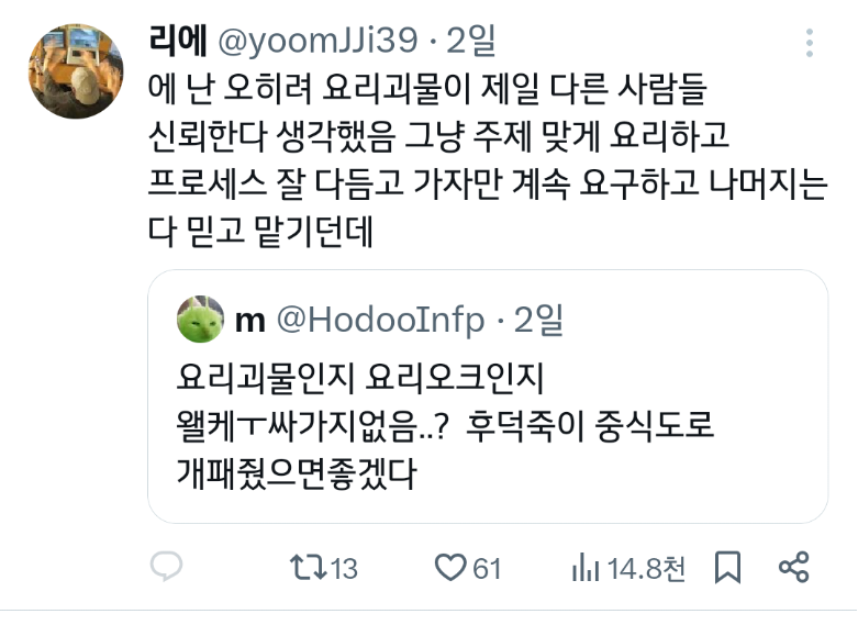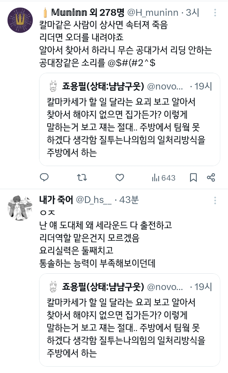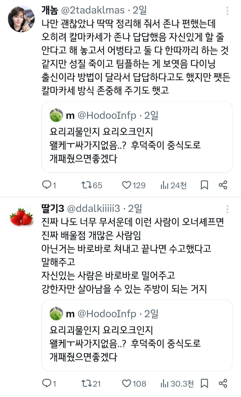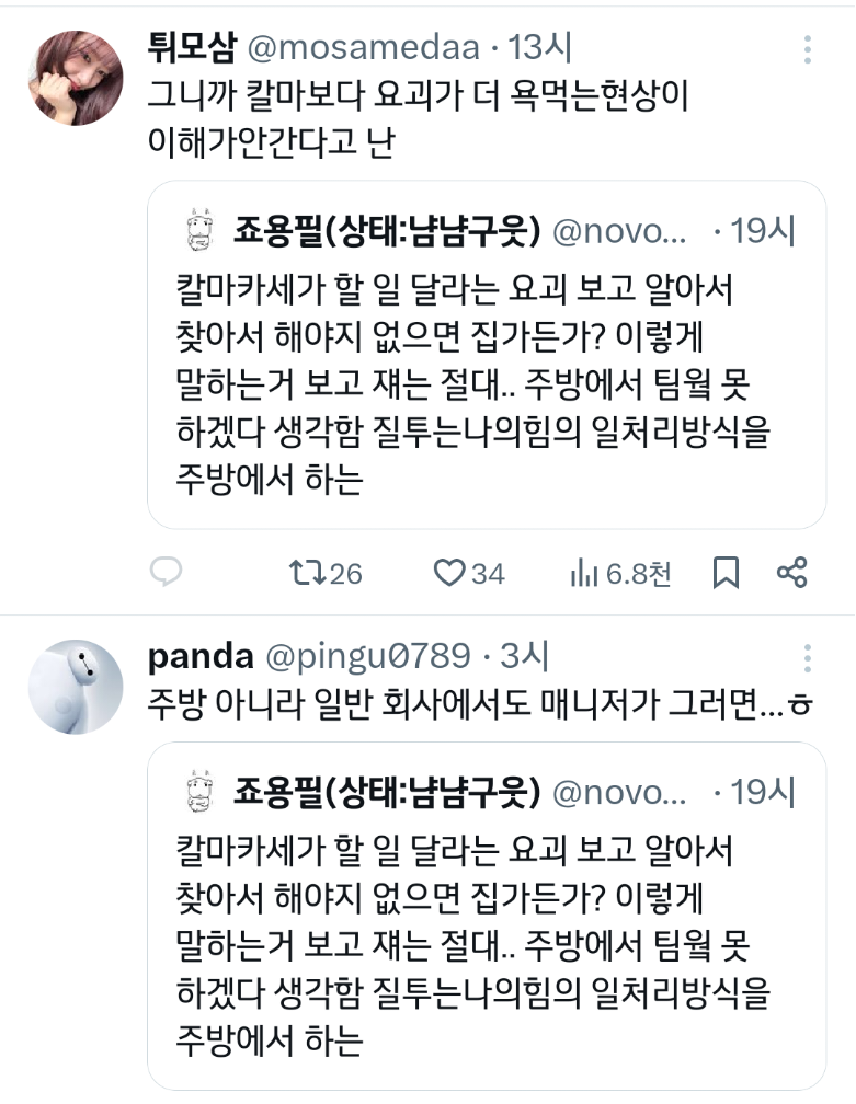작성자예예예예예예예예 작성시간 26.01.03 저 둘 상황에선 나도 요괴편이었음. 칼마카세 본인 레시핀데 본인이 정리안해주면 누가해줘