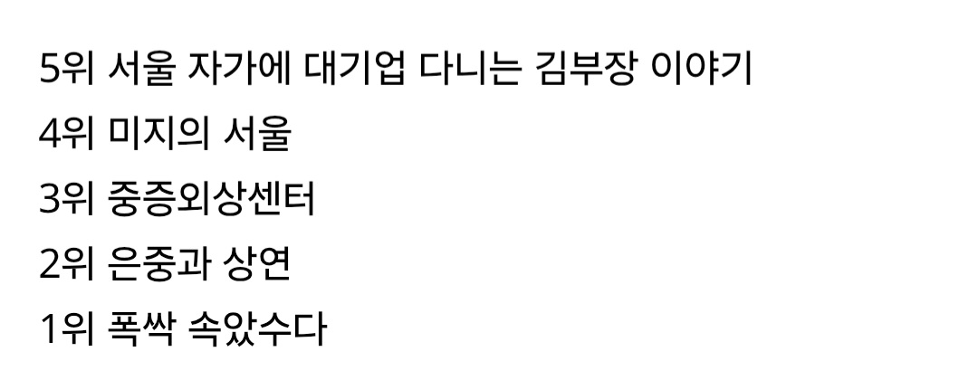 [흥미돋]유튜버 단군이 뽑은 올해 <베스트&워스트> 드라마ㆍ영화 작성자크리스마스쫀득쿠키|작성시간25.12.26|조회수11,452 목록 댓글 16 글자크기 작게가 글자크기 크게가 출처: https://theqoo.net/square/4040174389<베스트 드라마><워스트 드라마><베스트 영화><워스트 영화> 다음검색 현재 게시글 추가 기능 열기 북마크 공유하기 신고 센터로 신고 댓글 댓글 16 댓글쓰기 답글쓰기 댓글 리스트 작성자닉임 | 작성시간 25.12.26 난 올해 드라마 영화 둘다 많이는 안 봤지만 세계의주인 미지의서울 둘이 내 베스트 작성자엄청나게성공한여시 | 작성시간 25.12.26 배스트에 김부장, 중증외상..? 오... 작성자뭐어땨용ㅋ | 작성시간 25.12.26 국보 재밌나보네 ... 보러갈까 작성자크쿠다쓰 | 작성시간 25.12.26 난 김부장, 은중과상연이 1등 작성자뉘갸갹 | 작성시간 25.12.27 국보....? 프랑켄 콘클라베 세주 얼굴은 ㅇㅈ 댓글 전체보기