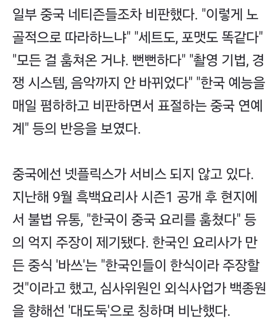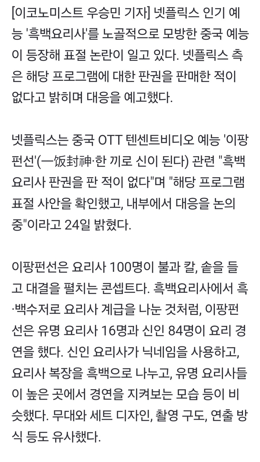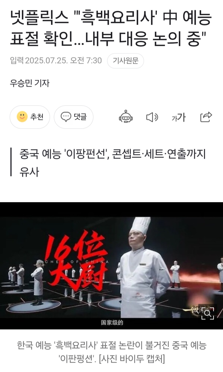 [스크랩] [기타]넷플릭스 "'흑백요리사' 中 예능 표절 확인…내부 대응 논의 중" 작성자본인 닉네임.|작성시간25.12.26|조회수27,339 목록 댓글 11 글자크기 작게가 글자크기 크게가 출처: https://n.news.naver.com/article/243/0000081884?sid=101넷플릭스 "'흑백요리사' 中 예능 표절 확인…내부 대응 논의 중"넷플릭스 인기 예능 '흑백요리사'를 노골적으로 모방한 중국 예능이 등장해 표절 논란이 일고 있다. 넷플릭스 측은 해당 프로그램에 대한 판권을 판매한 적이 없다고 밝히며 대응을 예고했다. n.news.naver.com전문출처로)넷플릭스 꼭 대응해라!! 다음검색 스크랩 원문 : *여성시대* 차분한 20대들의 알흠다운 공간 현재 게시글 추가 기능 열기 북마크 공유하기 신고 센터로 신고 댓글 댓글 11 댓글쓰기 답글쓰기 댓글 리스트 작성자162번 | 작성시간 25.12.26 이거 진짜어이가없네 작성자스칼릿 조핸슨 | 작성시간 25.12.26 으이고 ㅉㄲ들 맨날 우리나라 프로 따라만 하고ㅉㅉ 넷플 고소해라 작성자열네번째장미 | 작성시간 25.12.26 너네 오리지날은 분서갱유 문화대혁명 천안문 사태 밖에 없쟈나 ㅋㅋㅋ 작성자치왈왈왈 | 작성시간 25.12.27 아 메뉴도 따라했어? ㅋㅋㅋㅋㅋㅋ 작성자다잘되거라 | 작성시간 25.12.28 놀랍지도 않아 이제 댓글 전체보기