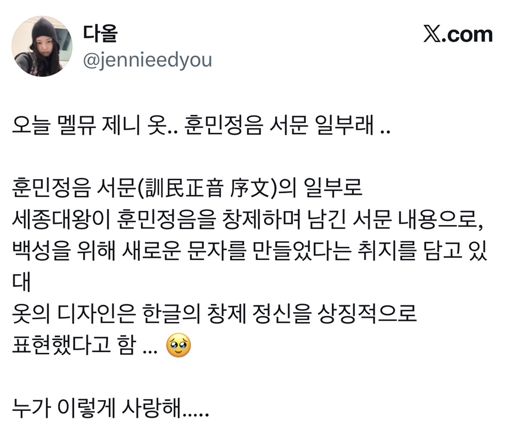 [스크랩] [흥미돋]제니가 시상식 무대에서 입은 한글로 적혀진 의상의 뜻..jpg 작성자어머사피엔스|작성시간25.12.26|조회수24,325 목록 댓글 19 글자크기 작게가 글자크기 크게가 출처: https://x.com/jennieedyou/status/2002378322744078570훈민정음 서문 일부세종대왕이 훈민정음을 창제하여 남긴 서문 내용+ 고전시 다음검색 스크랩 원문 : *여성시대* 차분한 20대들의 알흠다운 공간 현재 게시글 추가 기능 열기 북마크 공유하기 신고 센터로 신고 댓글 댓글 19 댓글쓰기 답글쓰기 댓글 리스트 작성자한국언론신뢰도최하위 | 작성시간 25.12.26 너무좋아 작성자엘로떼 | 작성시간 25.12.26 진짜 너무 멋있다 작성자리차드 파커 | 작성시간 25.12.26 멋있다 작성자쟈근톡희 | 작성시간 25.12.27 진짜 멋져 작성자사장남천동남 | 작성시간 25.12.27 시발 제니야 언니 운다 진짜 댓글 전체보기