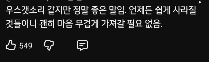 작성자얼죽아 협회장 작성시간 25.12.27 ㅋㅋㅋㅋㅋ저런 맘 먹기가 진짜 힘든듯.. 현재에 사는게 사람인데.. 그 현재=내 세상의 전부로 느껴지기 마련이잖아.. 저런 생각이 약간 불교 사상 아닌가 ㅋㅋㅋ