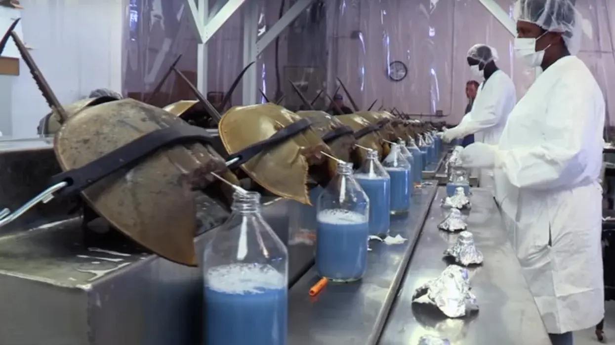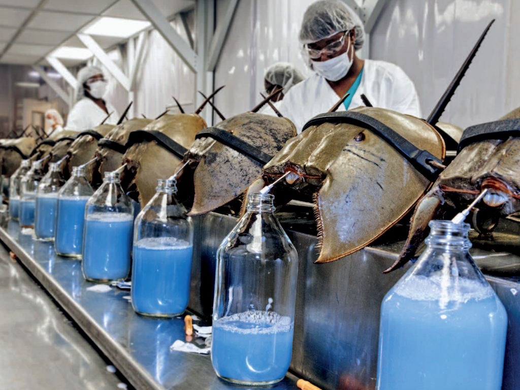 살아있는 투구게의 피를 채취하고 있는 장면(투구게의 피는 헤모글로빈이 없어 파란색임)