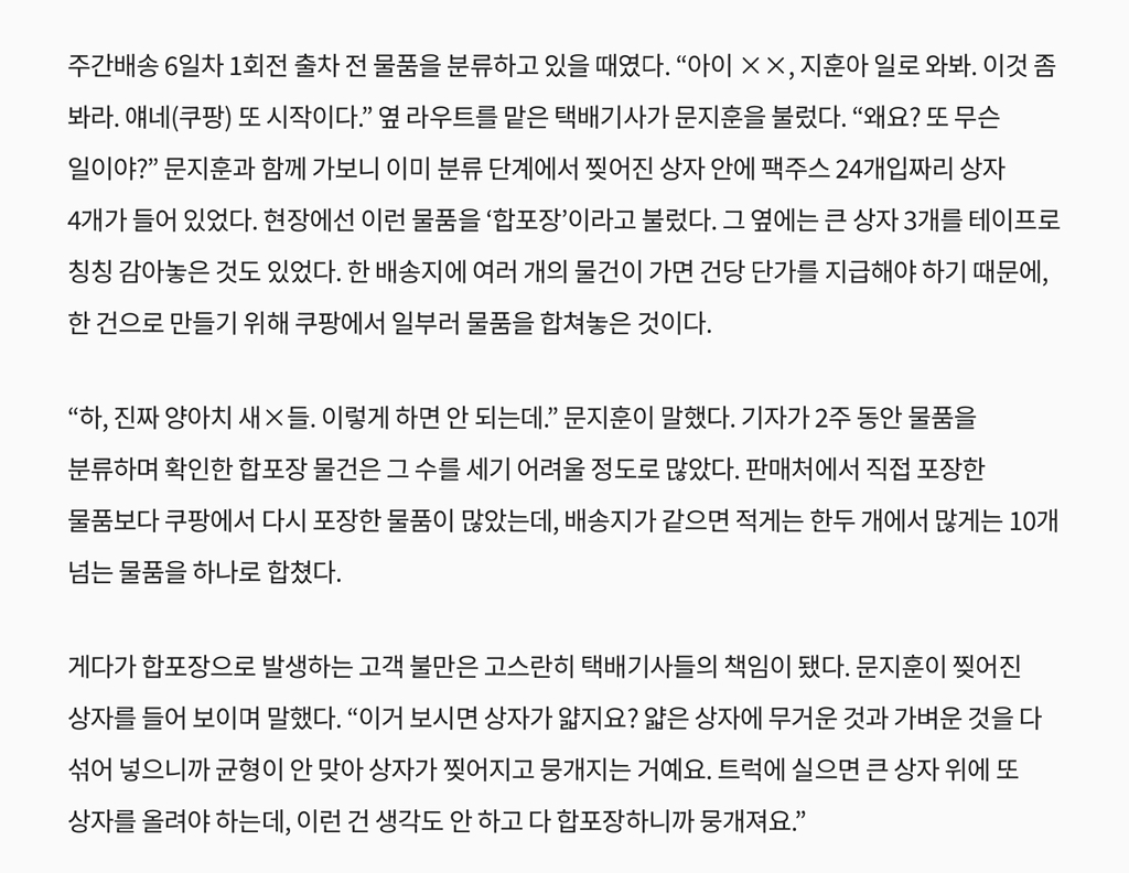 현장에선 이런 물품을 합포장 이라고 불렀다. 그 옆에는 큰 상자 3개를 테이프로 칭칭 감아놓은 것도 있었다. 한 배송지에 여러 개의 물건이 가면 건당 단가를 지급해야 하기 때문에, 한 건으로 만들기 위해 쿠팡에서 일부러 물품을 합쳐놓은 것이다.