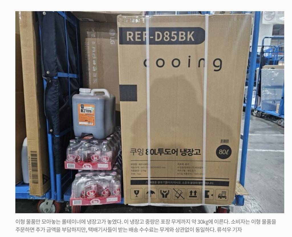이형 물품만 모아놓는 롤테이너에 냉장고가 놓였다. 이 냉장고 중량은 포장 무게까지 30키로가 넘는다. 소비자는 이런 물건을 주문할 때 추가 금액을 부담하지만 쿠팡 기사들이
